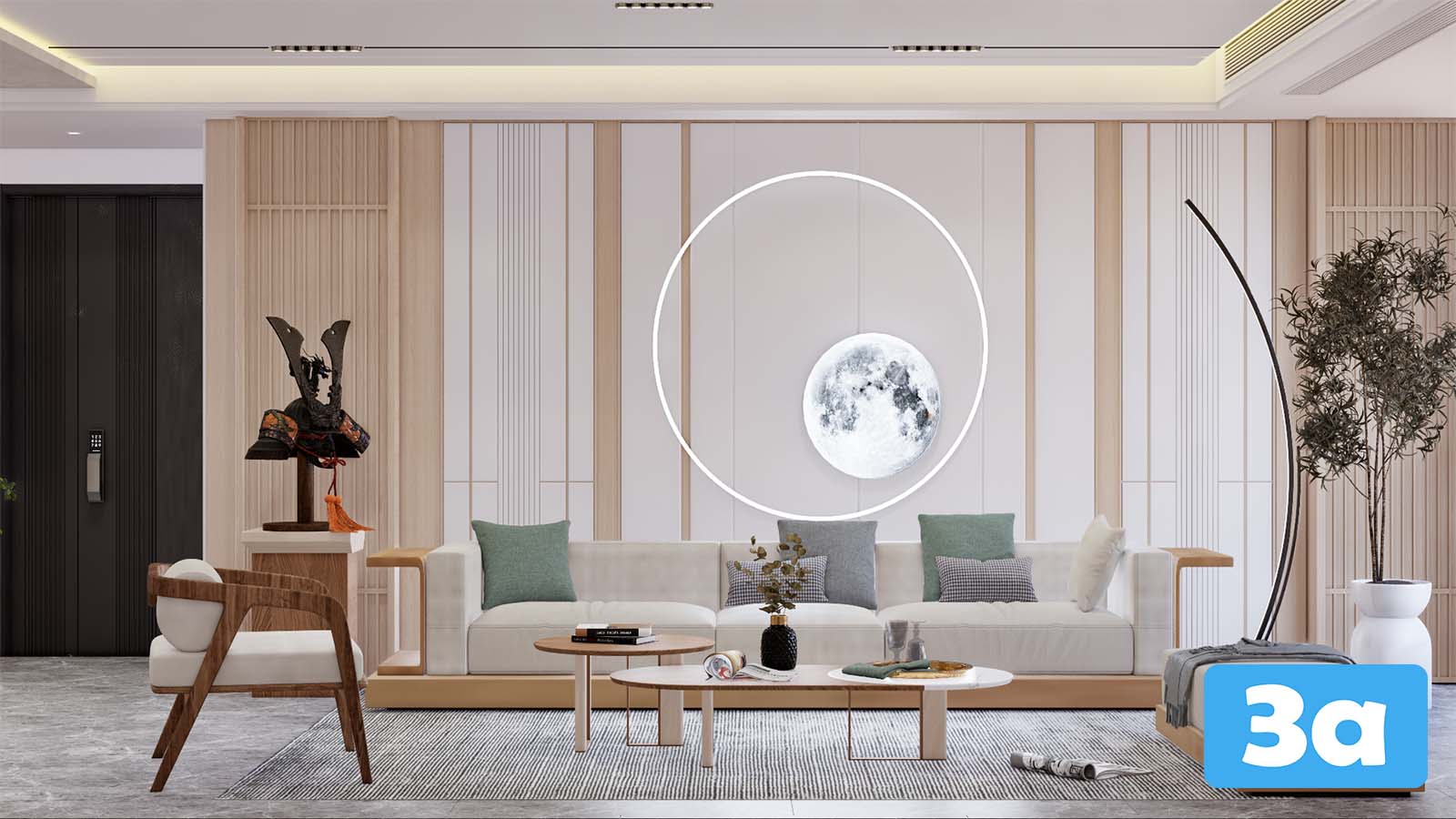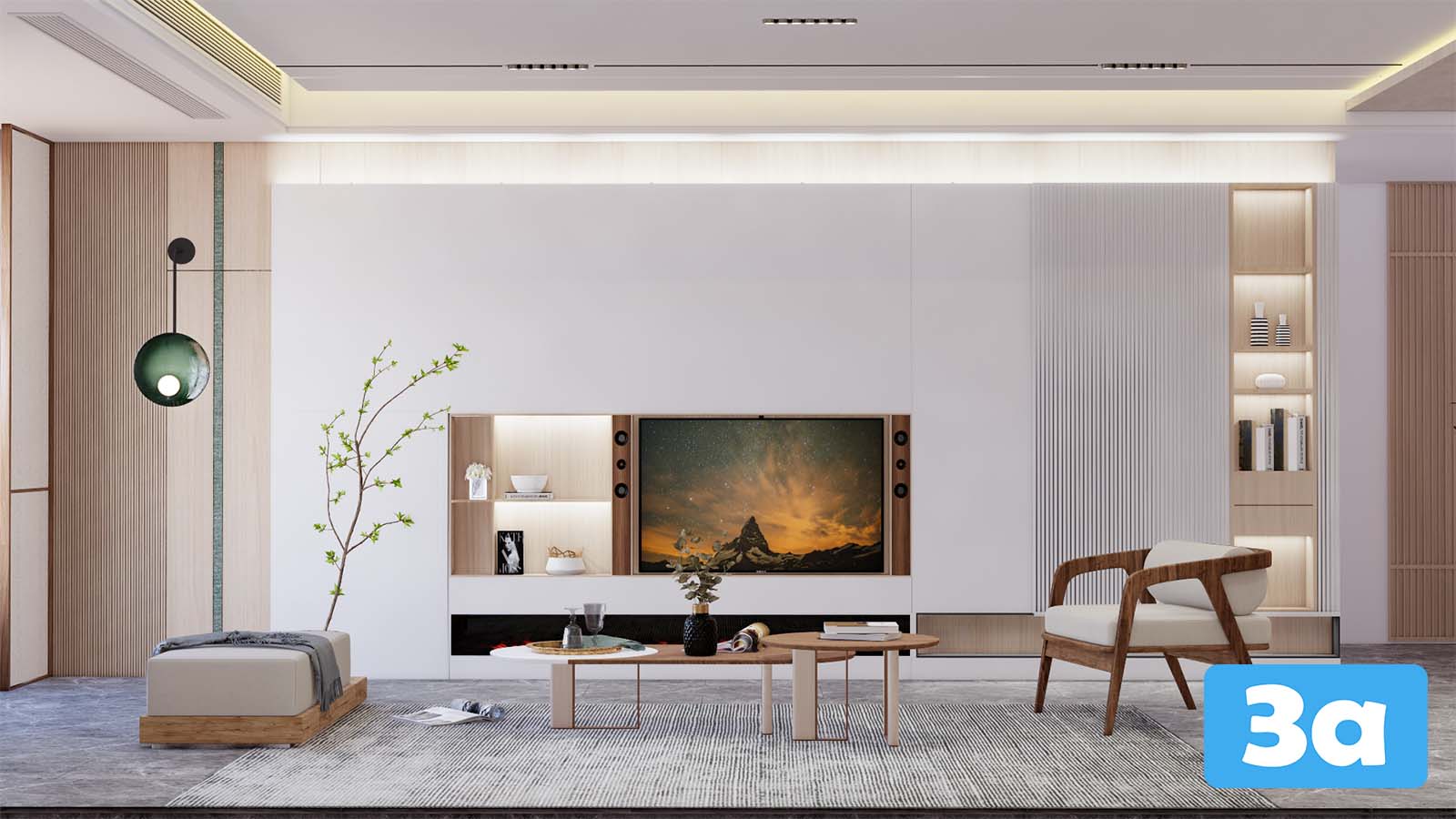 This 3D scene features a modern living room setup with stylish furniture and decor. The design showcases a blend of contemporary and minimalist elements, creating a cozy and inviting space. Explore the details of this living room scene to gather inspiration for your own interior design projects.
