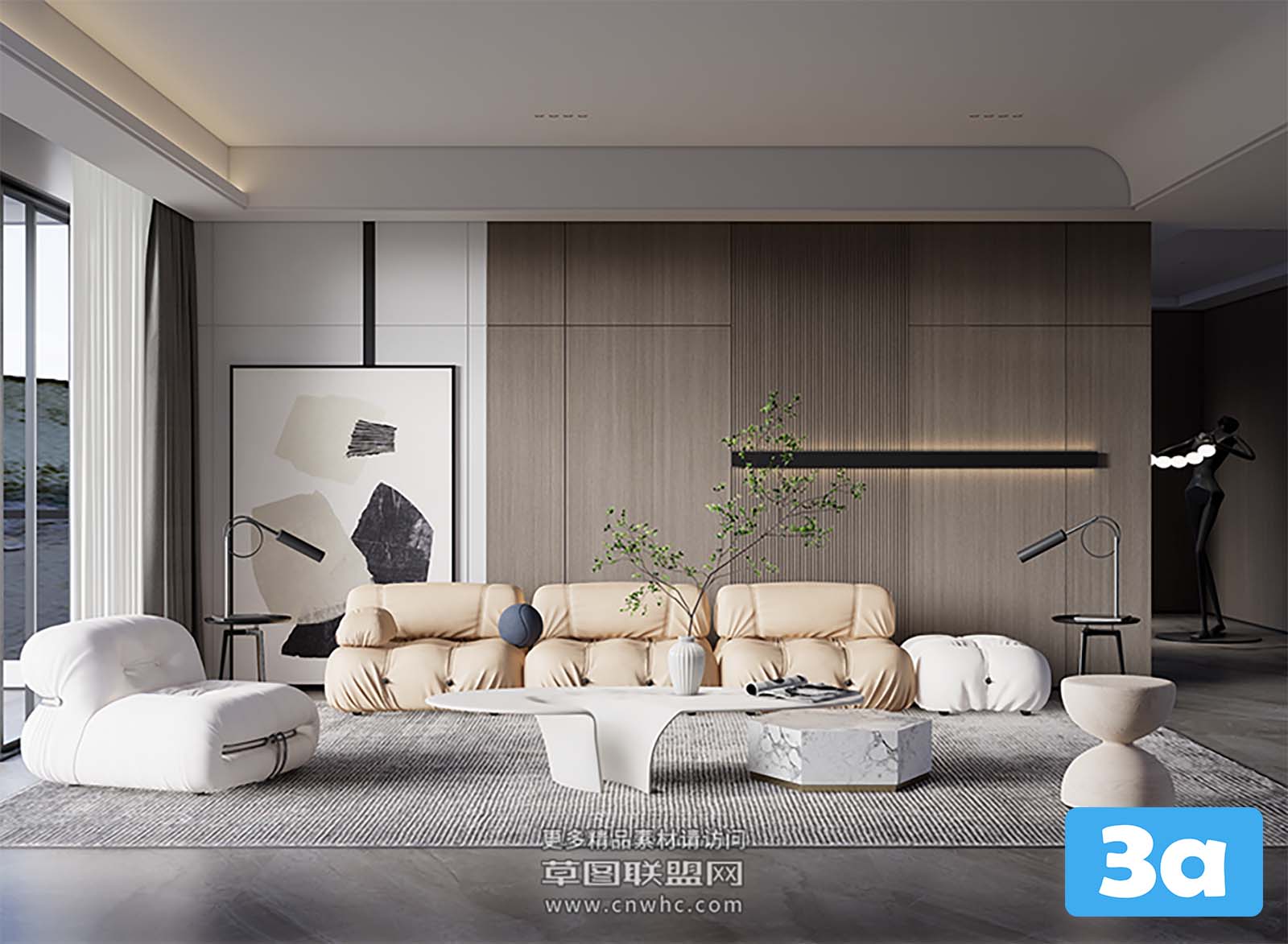 This 3D scene features a modern living room with stylish furniture and decor. The design showcases a blend of contemporary and elegant elements, creating a welcoming and cozy space. Explore the details of this interior design to gather inspiration for your own living room decor projects.