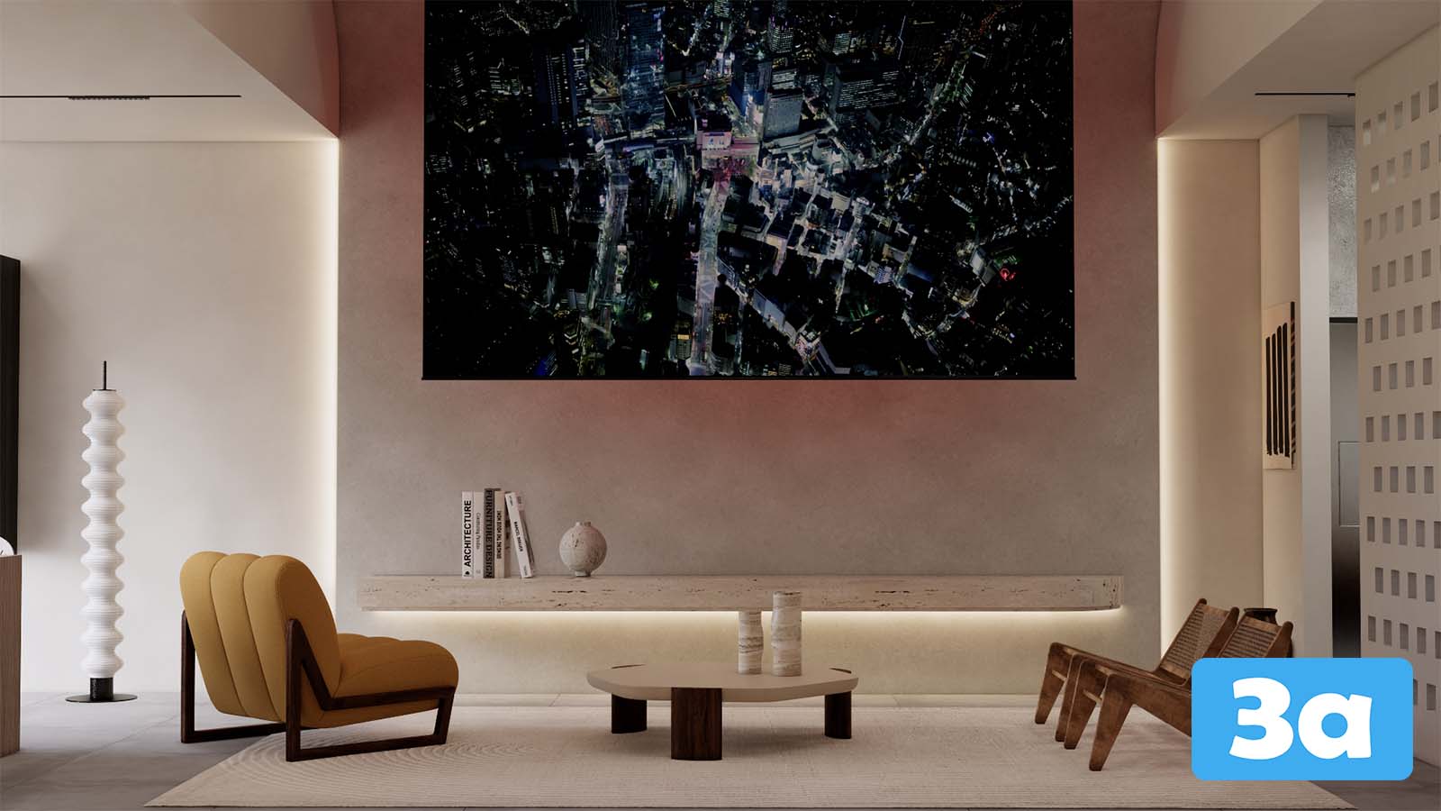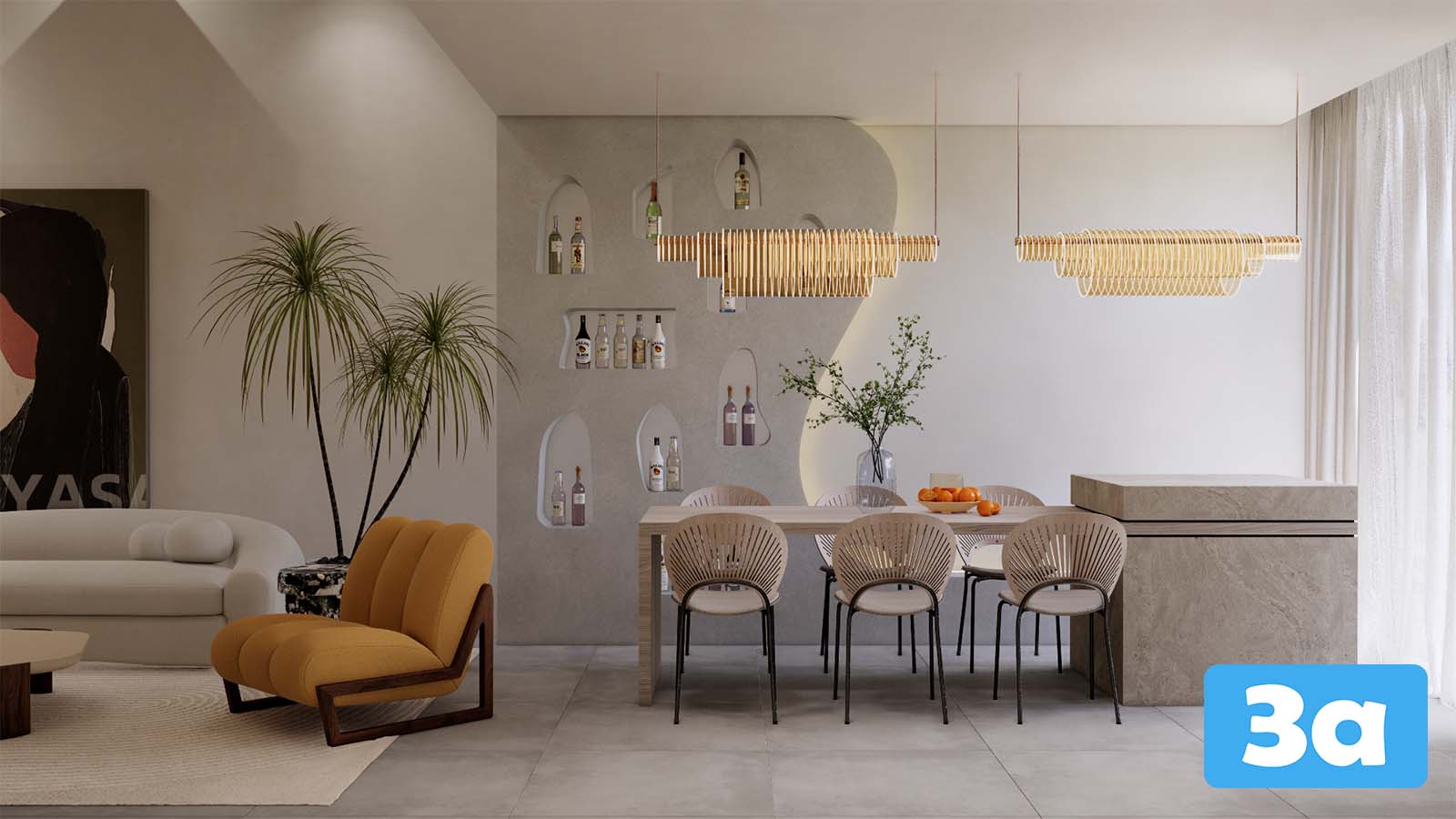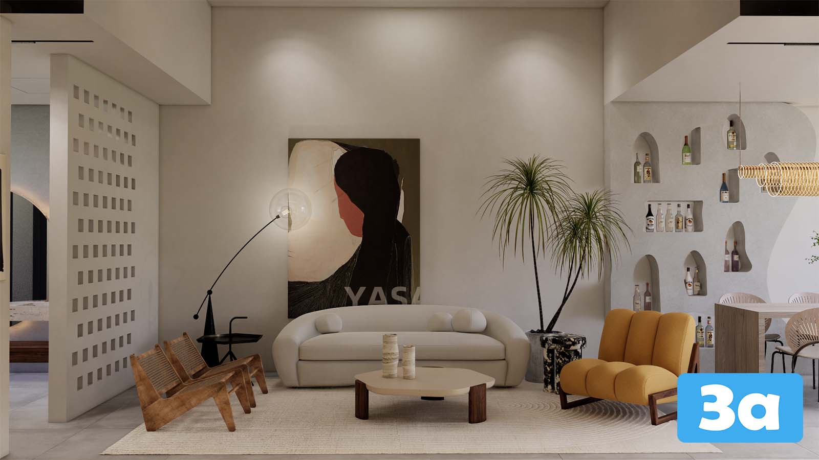 This 3D scene showcases a modern and cozy living room interior design. The space features a harmonious blend of contemporary furniture and decor elements, creating a welcoming and stylish ambiance. Explore this visualization for inspiration and ideas for your own living room design projects.