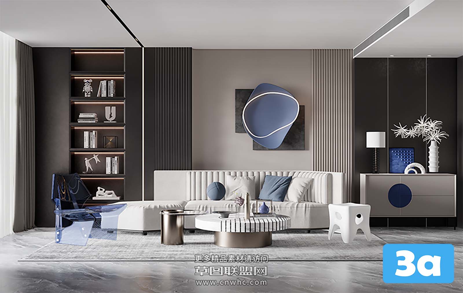 This 3D scene features a modern living room with stylish furniture and decor. The design showcases a blend of contemporary and elegant elements, creating a welcoming and cozy space. Explore the intricate details of the room layout, furniture placement, and decor choices in this visually appealing 3D rendering.