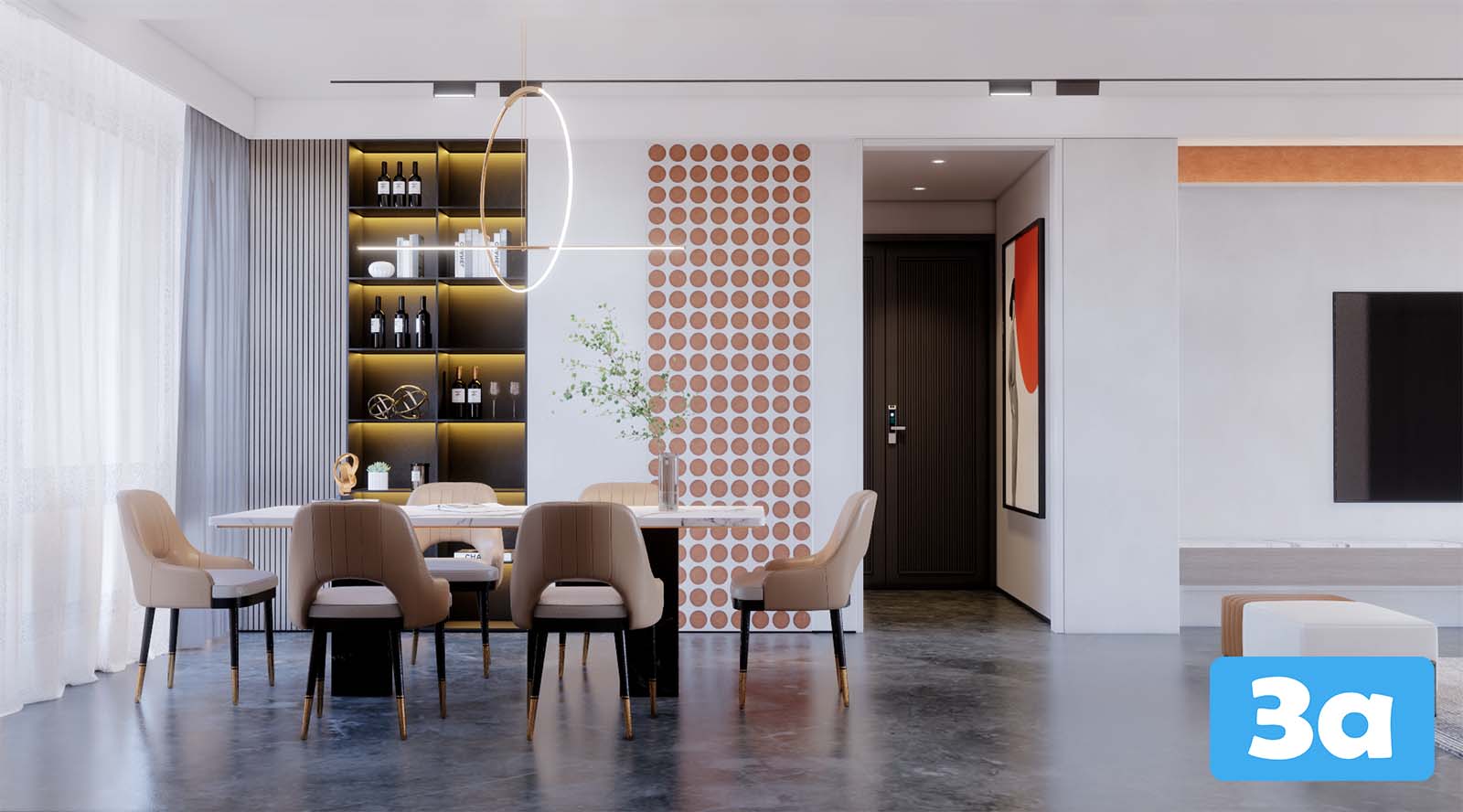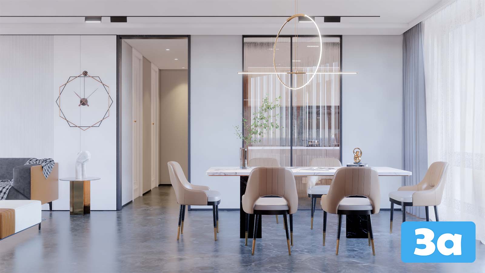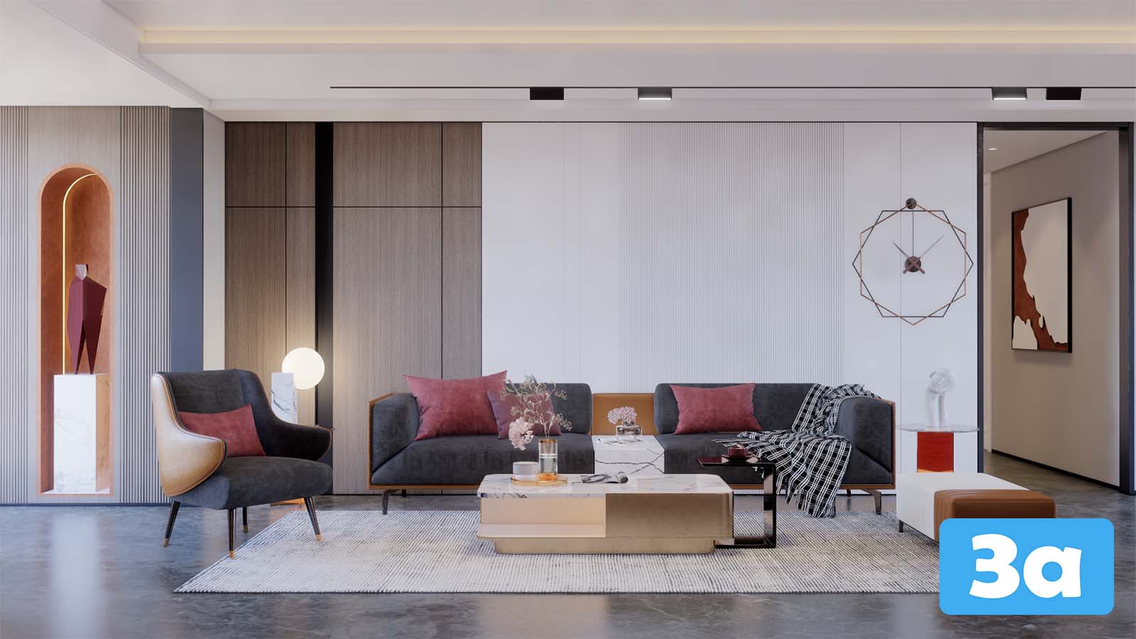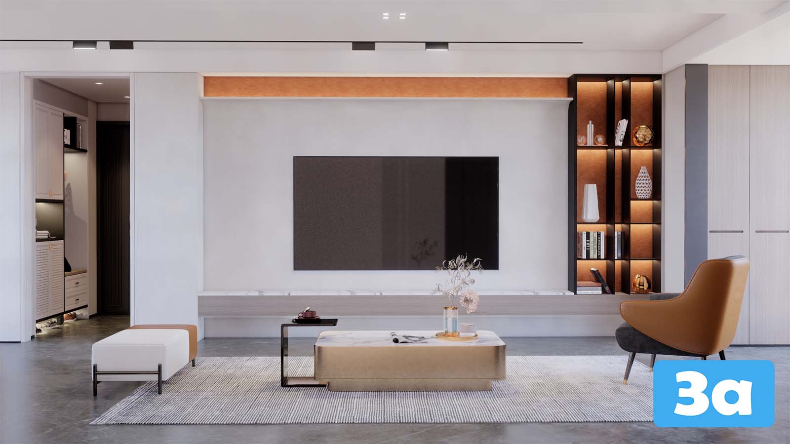 This 3D scene showcases a modern living room interior design with carefully selected furniture and decor items. The scene provides a realistic visualization of a stylish and comfortable living space, perfect for interior design enthusiasts and professionals looking for inspiration.