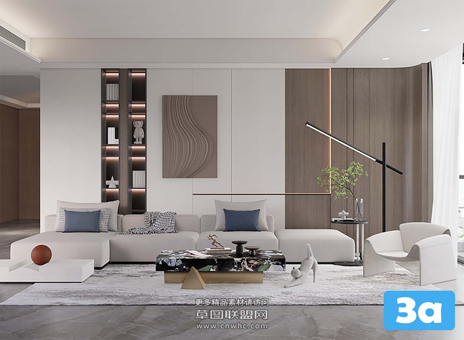 This 3D scene features a modern living room with stylish furniture and decor. The design showcases a contemporary approach to interior design, with a focus on comfort and aesthetics. Explore the details of this living room setting to gather inspiration for your own interior design projects.