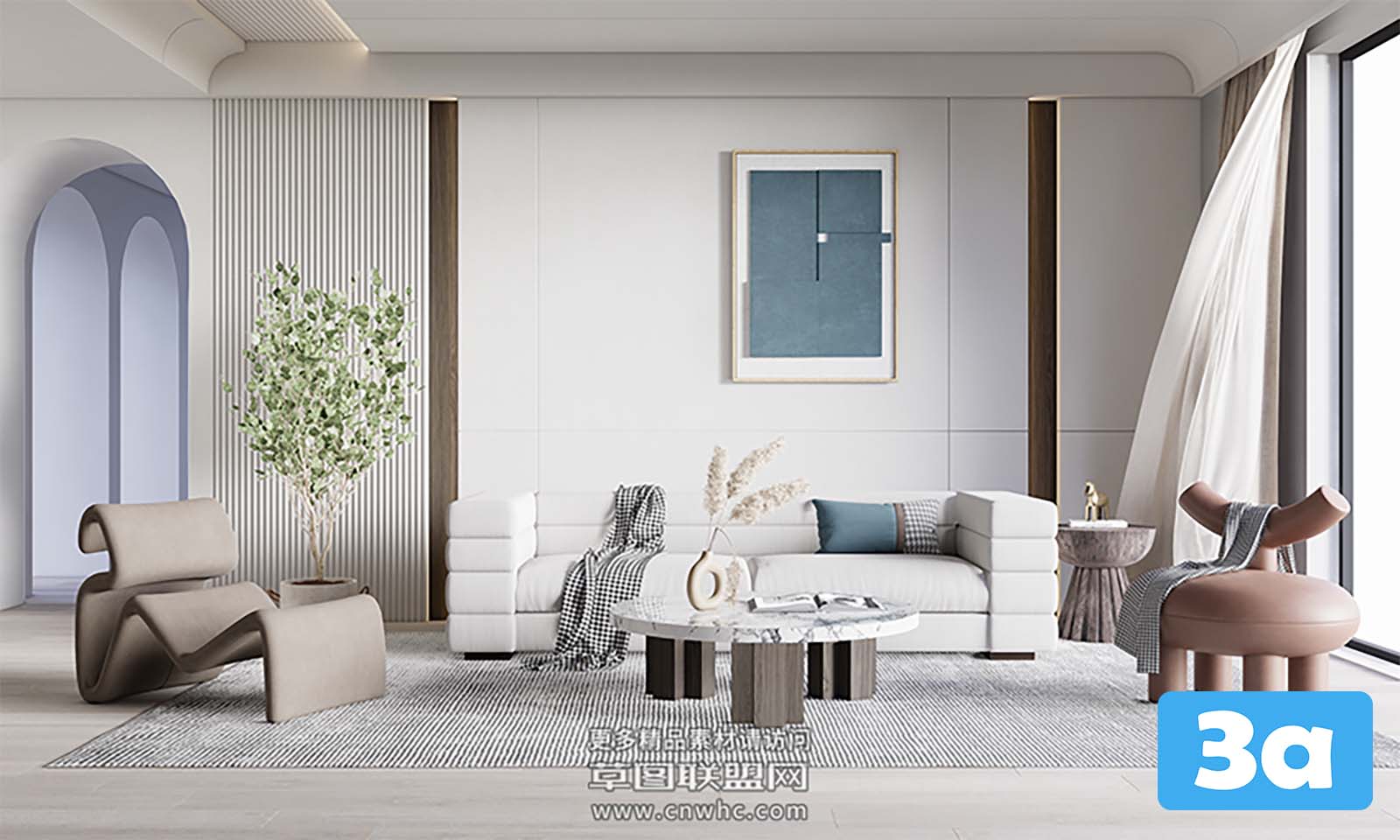 This 3D scene features a modern living room with stylish furniture and decor. The design showcases a blend of contemporary and minimalist elements, creating a cozy and inviting space. Explore the details of this interior design concept and get inspired for your own home decor projects.