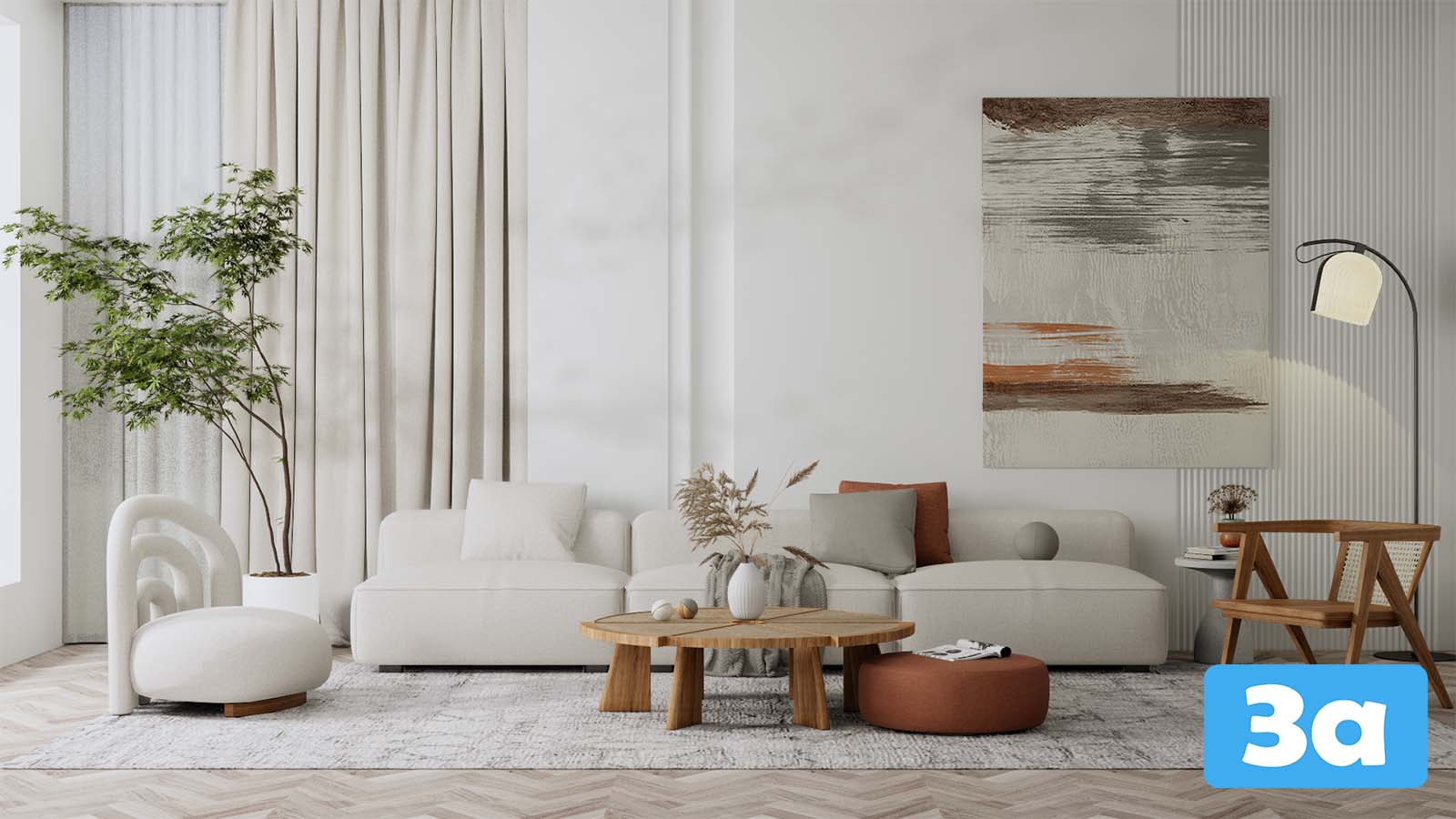 This 3D scene features a modern living room setup with stylish furniture and decor. The design showcases a blend of contemporary and minimalist elements, creating a cozy and inviting space. Explore the intricate details of the room layout, furniture placement, and decor choices in this visually appealing 3D rendering.