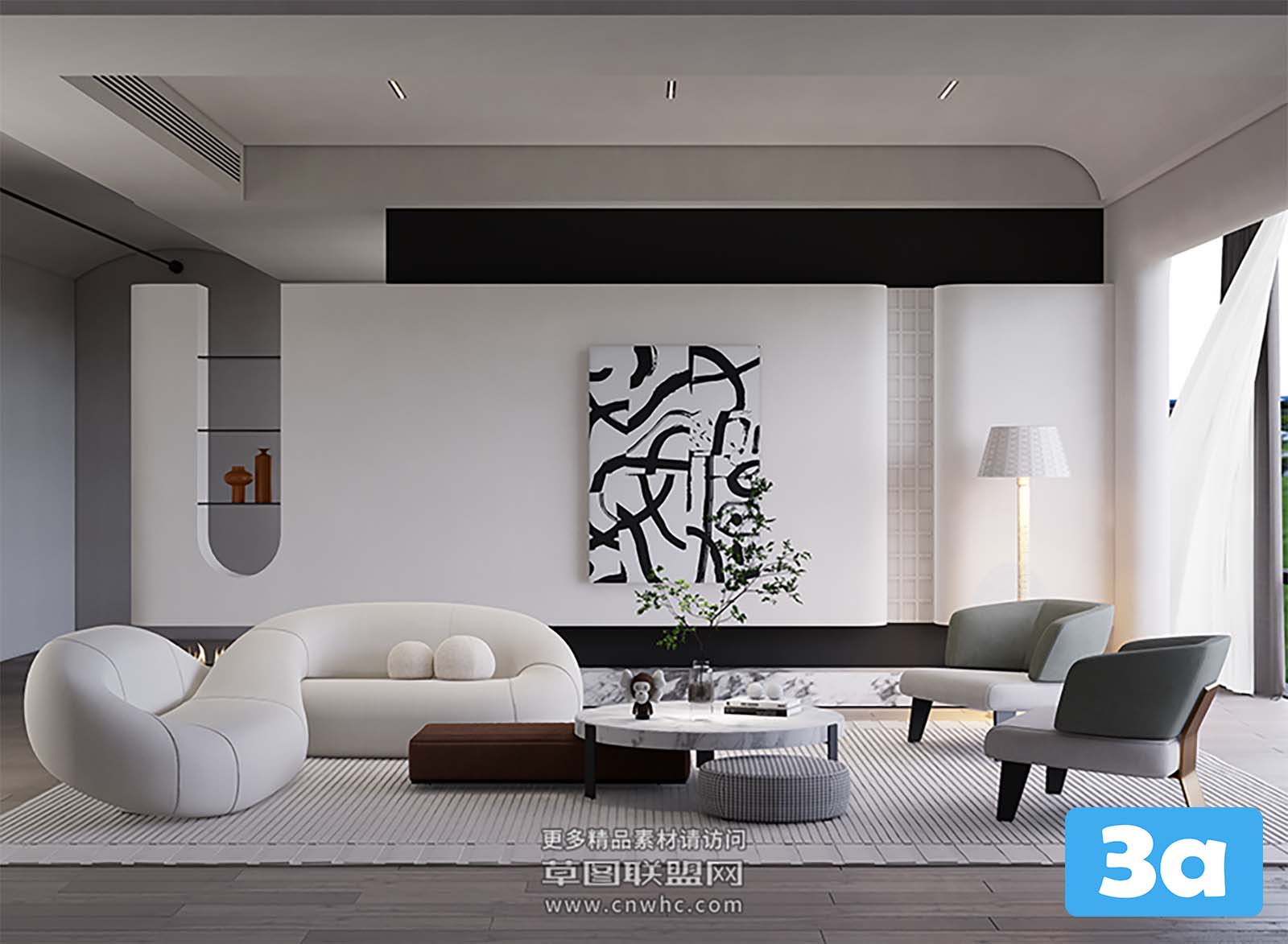 This 3D scene features a modern living room setup with stylish furniture and decor. The design showcases a blend of contemporary and minimalist elements, creating a cozy and inviting space. Explore the details of this interior design to gather inspiration for your own home decor projects.