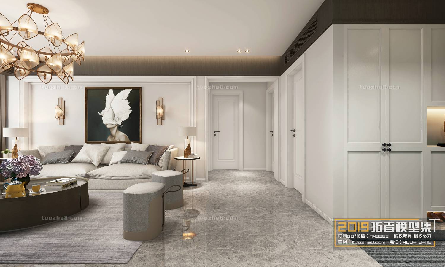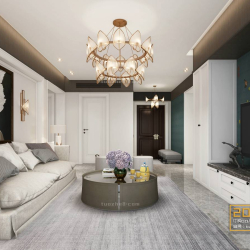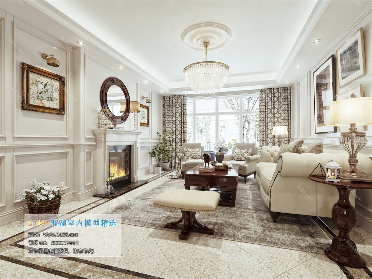 This 3D scene showcases a living room designed in American style. The interior features elegant furniture and home decor elements that create a cozy and inviting atmosphere. Explore the layout and design details of this beautifully crafted living space.
