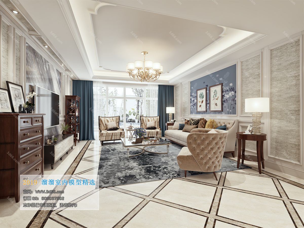 This 3D scene showcases a living room designed in American style. The room features elegant furniture, stylish decor, and a cozy ambiance. Perfect for interior design enthusiasts and professionals looking for inspiration for their projects.