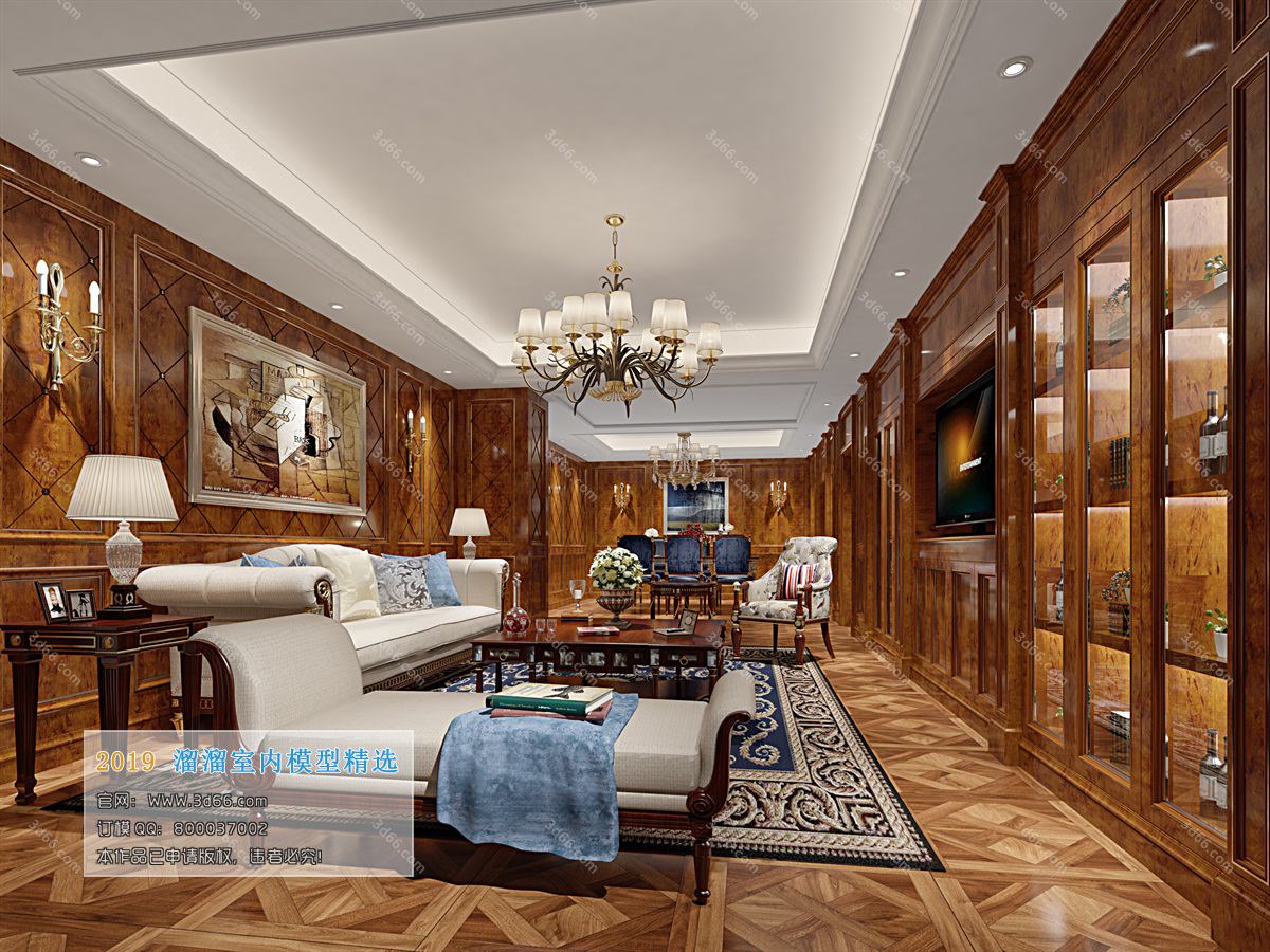This 3D scene showcases a living room designed in the American style. The room features elegant furniture, modern decor, and a cozy ambiance. Perfect for interior design enthusiasts looking for inspiration.