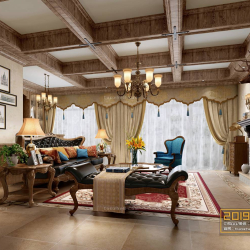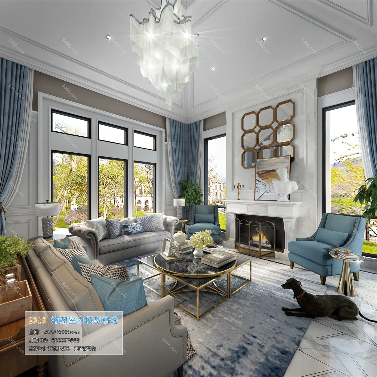 This 3D scene showcases a beautifully designed living room in American style. The interior features elegant furniture, stylish decor, and a cozy ambiance. Explore the intricate details of the room and get inspired for your own interior design projects.
