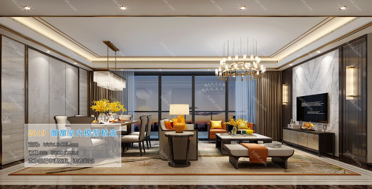 This 3D scene showcases a living room designed in a Chinese style, blending traditional elements with modern elegance. The furniture and decor create a harmonious and inviting space, perfect for interior design inspiration.