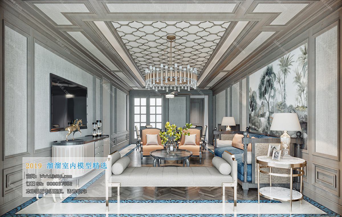 This 3D scene showcases a living room designed in a Chinese style, featuring traditional furniture and cultural elements. The intricate details and design choices create a harmonious and elegant space that reflects the beauty of Chinese interior design.