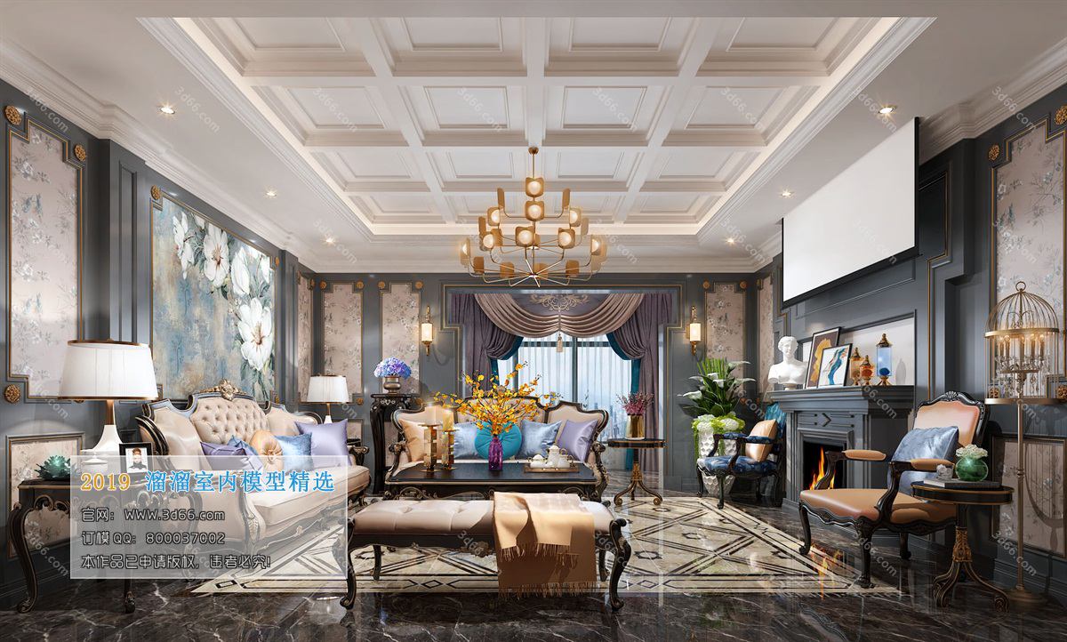 This 3D scene showcases a luxurious living room designed in European style. The interior features elegant furniture, intricate details, and a sophisticated color palette. Experience the charm of European decor in this beautifully crafted 3D model.