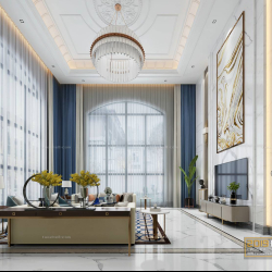 This 3D scene showcases a luxurious living room designed in European style. The room features elegant furniture, intricate decor, and a sophisticated color palette. Explore the details of this beautifully crafted interior design concept.