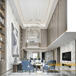 This 3D scene showcases a modern living room design with stylish furniture and contemporary elements. The interior is elegantly designed to create a cozy and inviting space. Explore the details of the furniture arrangement and decor in this preview image.