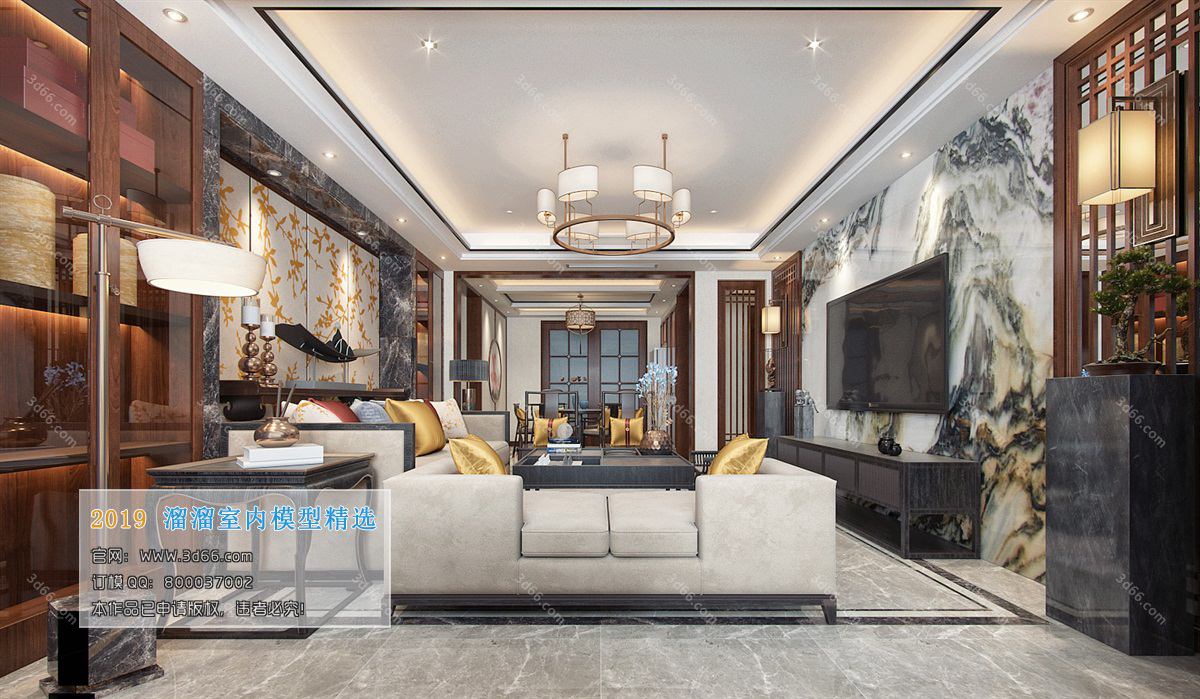 This 3D scene showcases a living room space designed in a Chinese style. The room features a blend of traditional and modern elements, creating an atmosphere of elegance and sophistication. Explore the intricate furniture and decor details that make this space unique and visually appealing.
