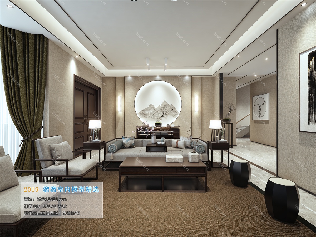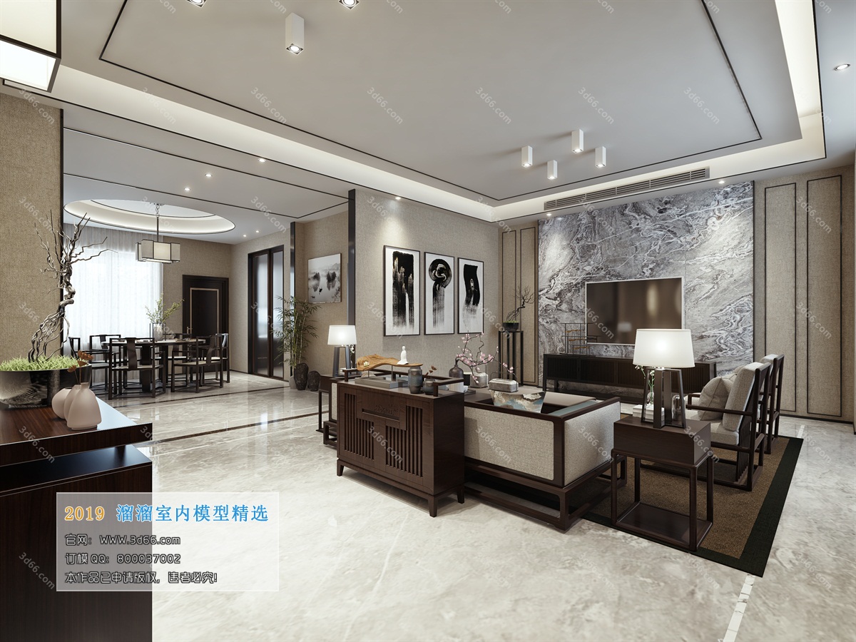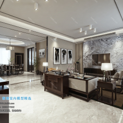 This 3D scene showcases a living room space designed in a Chinese style. The intricate details and traditional elements create a warm and inviting atmosphere. Explore the layout and design of this space to gather inspiration for your own interior design projects.