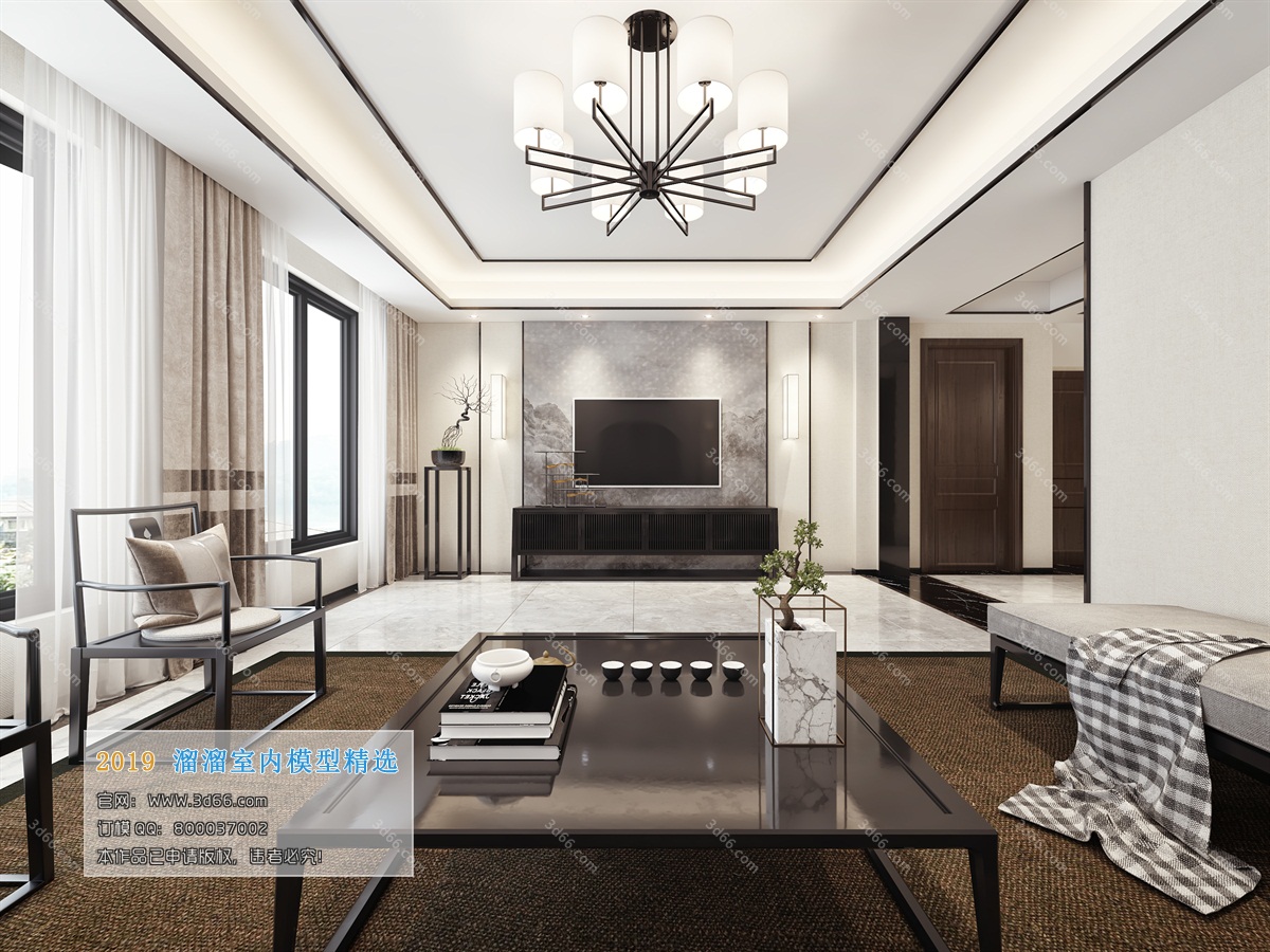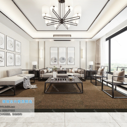 This 3D scene showcases a living room space designed in a Chinese style. The room features a blend of traditional and modern elements, with intricate furniture and decor. Explore the details and design of this unique space for inspiration in your own projects.