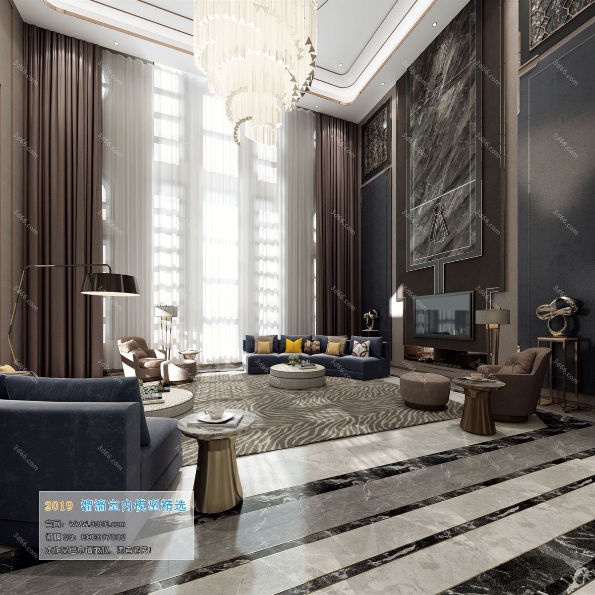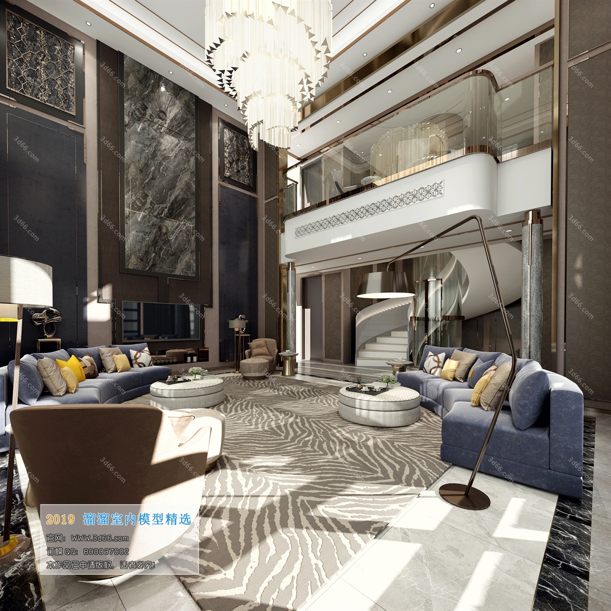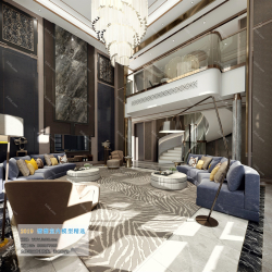 This 3D scene showcases a modern living room space with a contemporary design aesthetic. The room features sleek furniture, clean lines, and a neutral color palette. Perfect for those looking for inspiration for their own interior design projects.