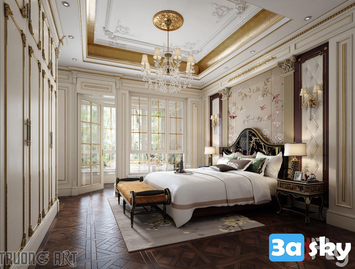 This 3D scene showcases a luxurious bedroom interior design with elegant and sophisticated decor. The room features high-quality furniture, soft lighting, and a calming color palette. Perfect for those seeking inspiration for their own bedroom design projects.