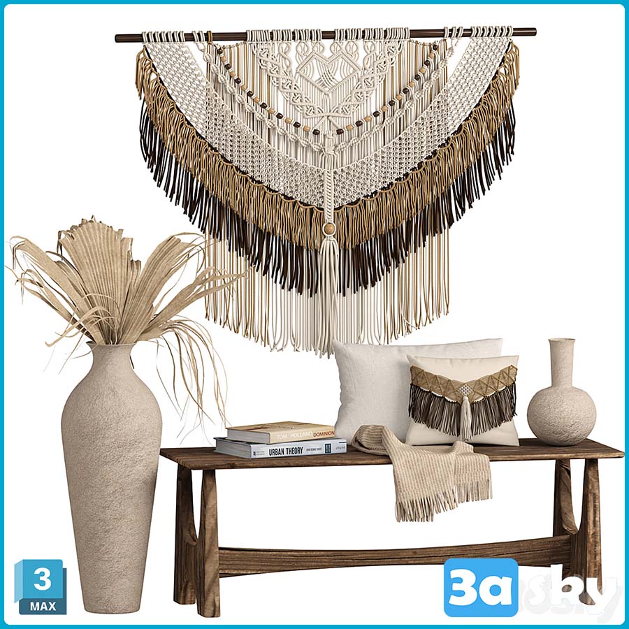 This 3D model features a set of macrame decorations that can be used to enhance the aesthetics of interior spaces. The intricate designs and bohemian charm of these macrame pieces make them a perfect addition to any modern or boho-inspired decor theme. Use this model to bring a touch of elegance and uniqueness to your virtual design projects.