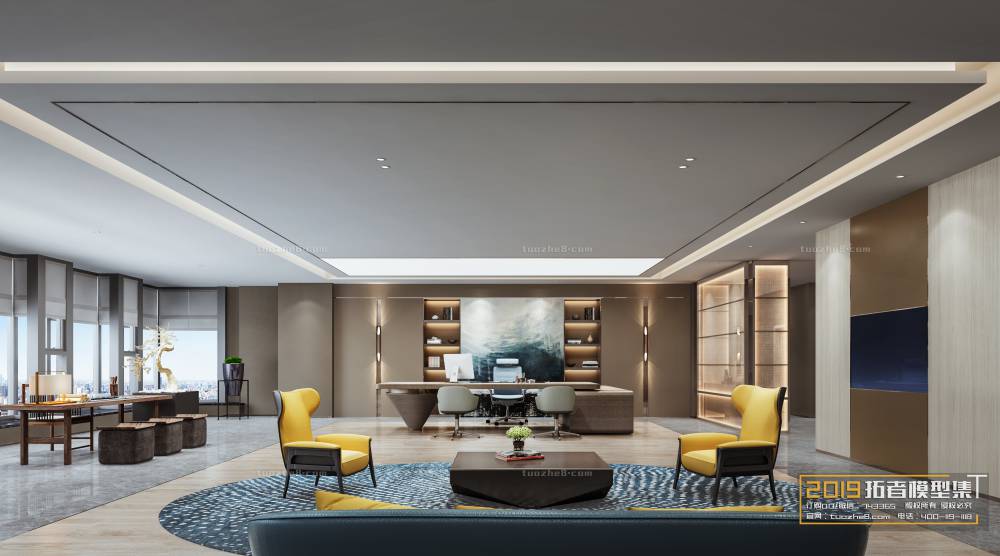 This 3D scene features the Manager Room 018, designed with a modern and stylish interior suitable for office spaces and professional environments. The scene includes furniture, lighting, and decor elements to create a functional and aesthetically pleasing workspace.
