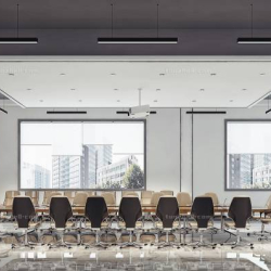This 3D scene showcases a modern meeting room lecture hall with elegant interior design. The space is well-lit and furnished with comfortable seating arrangements, ideal for presentations and discussions. The design features a blend of contemporary elements and functional layout, creating a professional and inviting atmosphere.