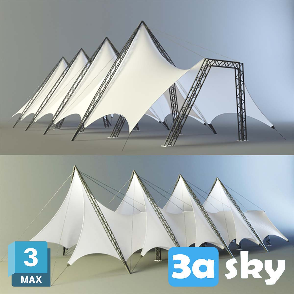 This 3D model features a Membran Tent designed for outdoor spaces. It is ideal for architectural visualization projects, providing a realistic representation of a modern outdoor tent structure. The high-quality details and textures make it suitable for various design applications in the architecture and outdoor design fields.