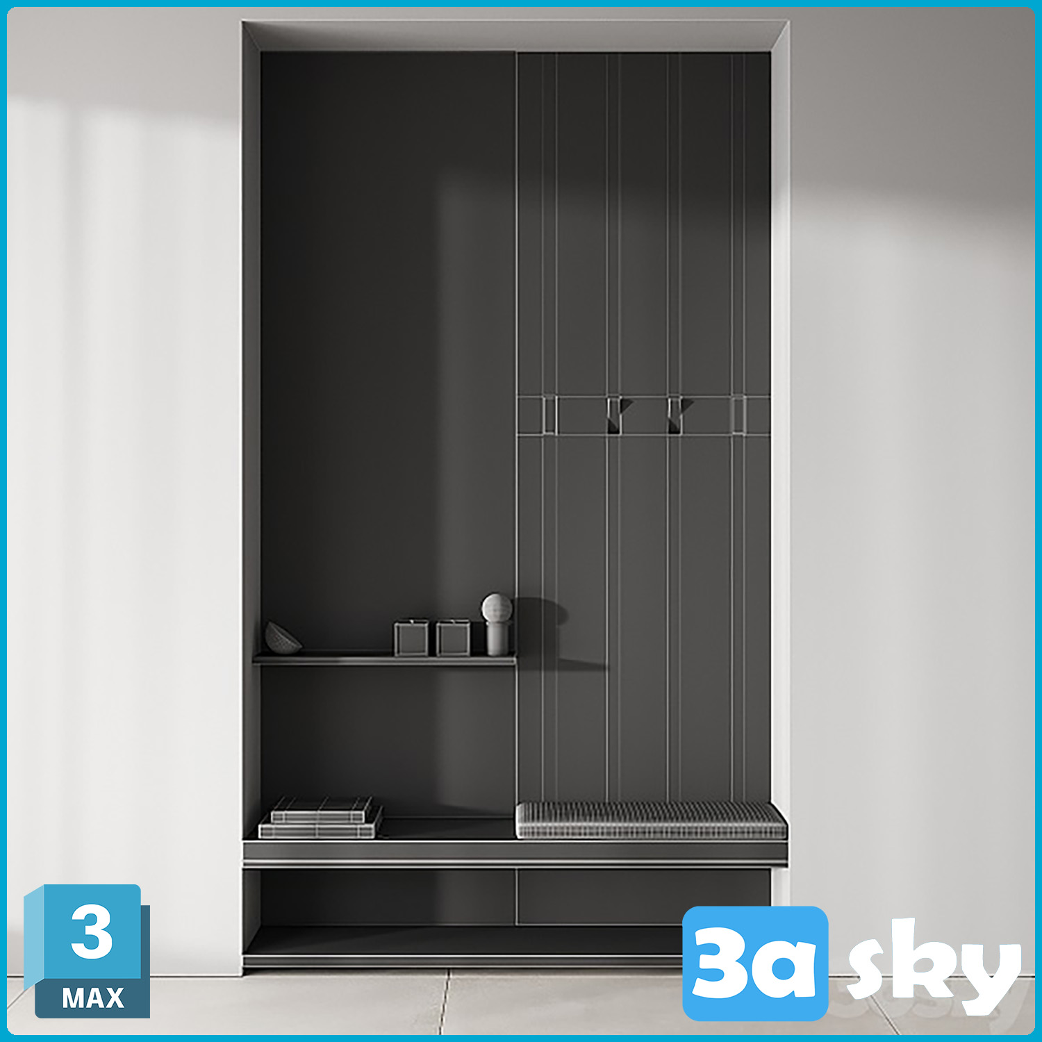 This 3D furniture model showcases a minimal wood hallway zone, ideal for interior design projects. The design features a sleek and modern aesthetic, perfect for creating a contemporary living space. Download this 3D model to enhance your architectural visualization projects.