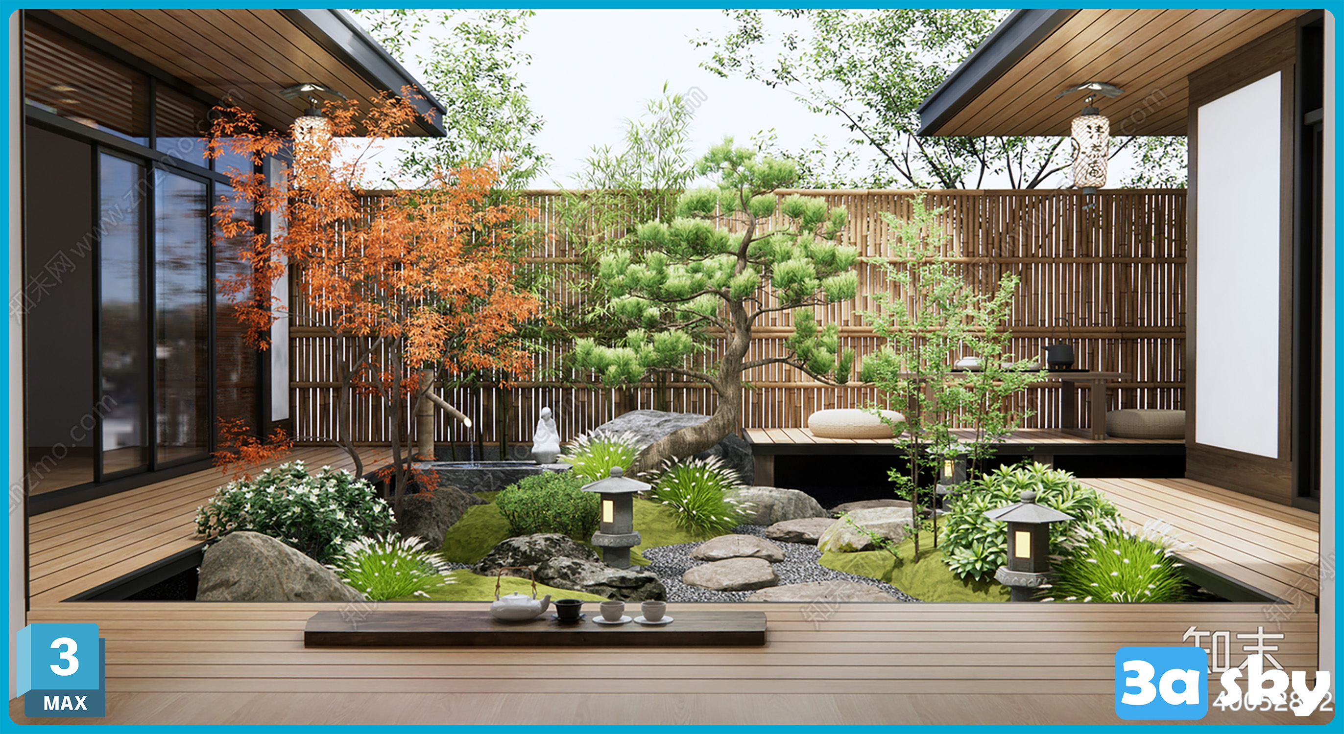 F_VR日式禅意庭院景观_枯山水庭院_居家院子_植物堆_灌木绿植_茶桌椅_石头3D模型ID_1140052852.zip