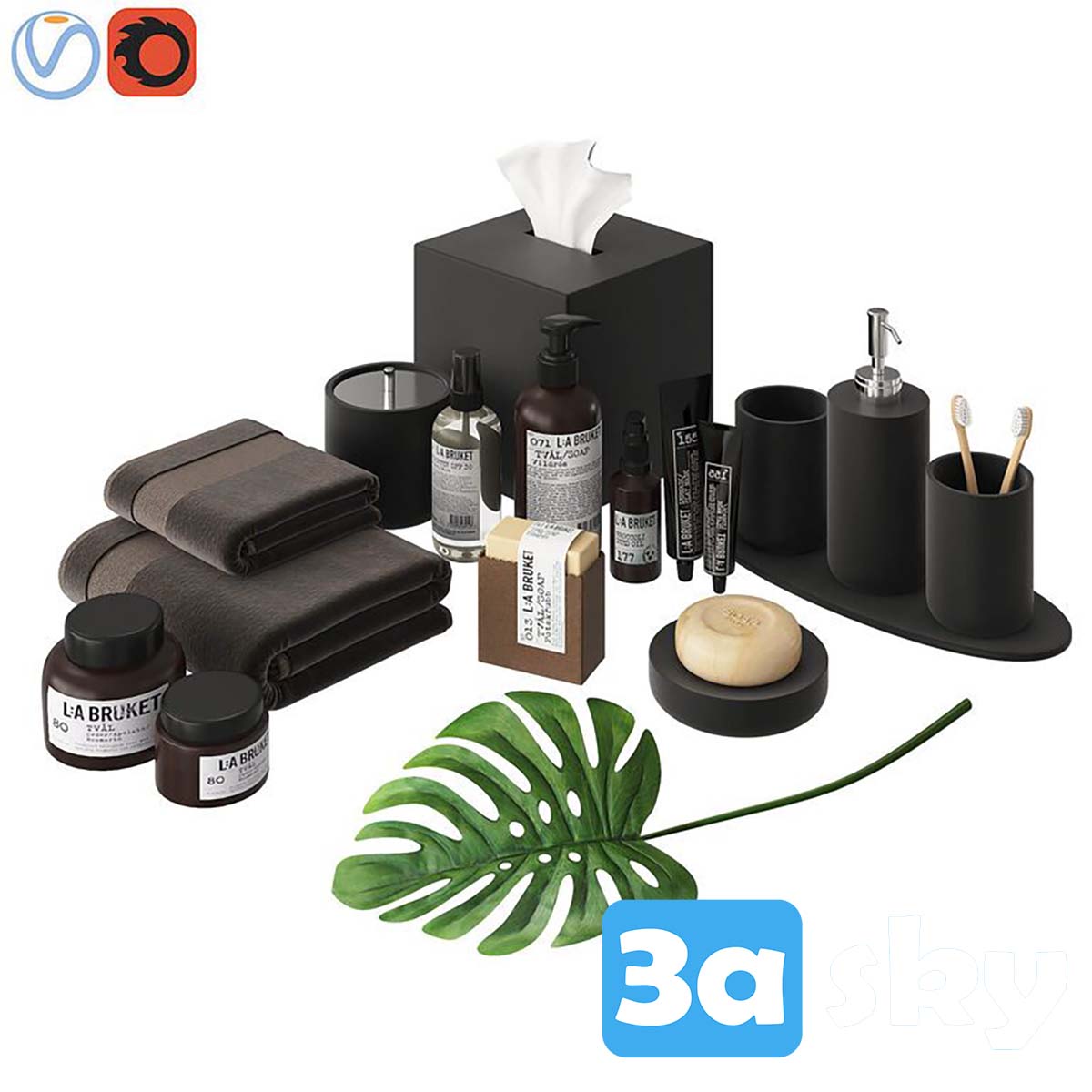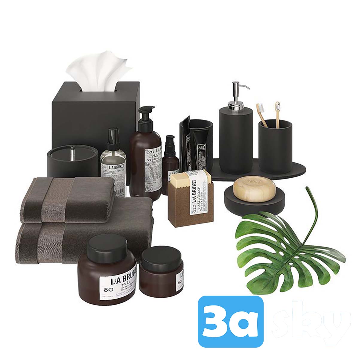 This 3D model showcases a collection of modern bathroom accessories designed in 3DS MAX. The model includes various items such as soap dispensers, toothbrush holders, and more, ideal for enhancing interior design projects. Download this detailed 3D model to add a touch of sophistication to your virtual bathroom designs.