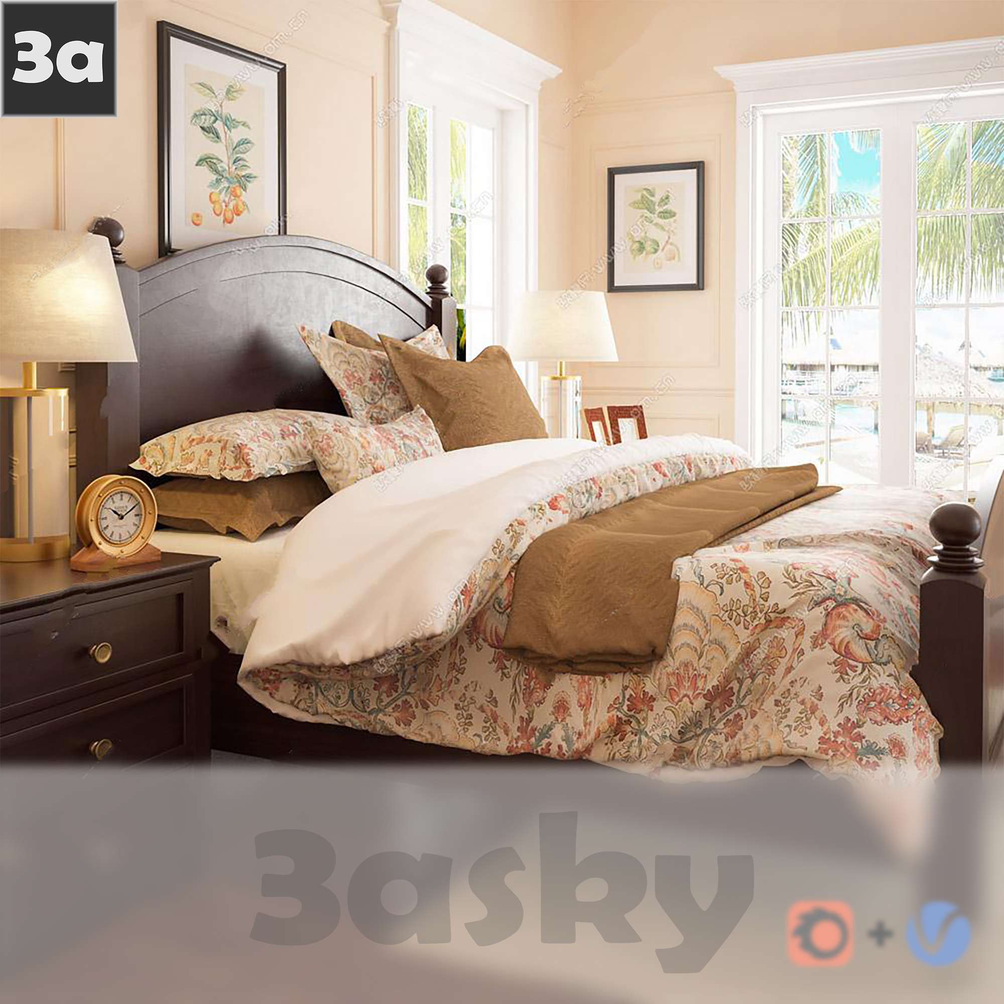 This 3D furniture model showcases a modern bed design, suitable for interior design projects and architectural visualization. The high-quality rendering and detailed textures make it a great addition to any 3D modeling project.