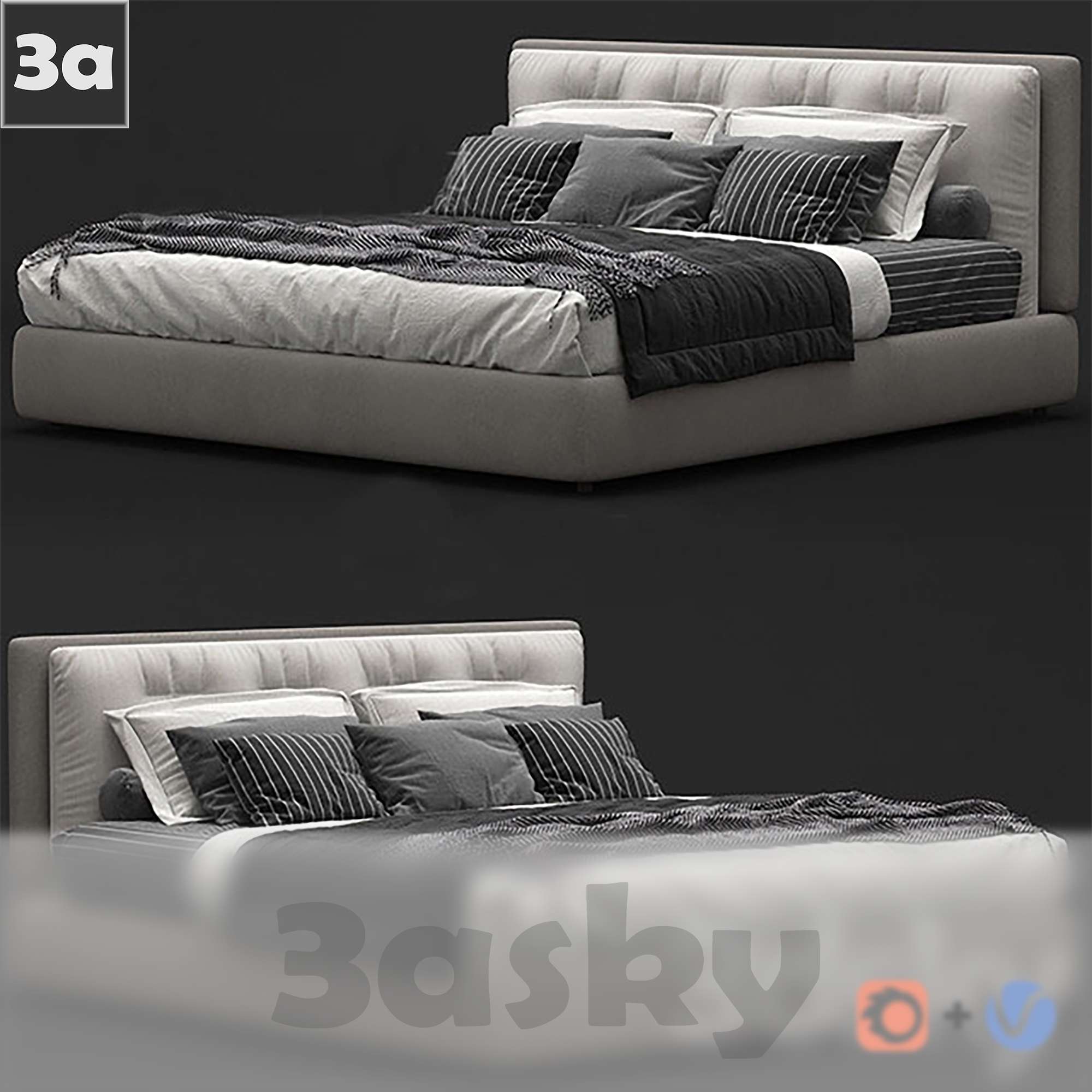 This 3D furniture model features a modern bed, ideal for interior design projects and architectural visualization. The high-quality design and attention to detail make it a perfect addition to any 3D rendering project.