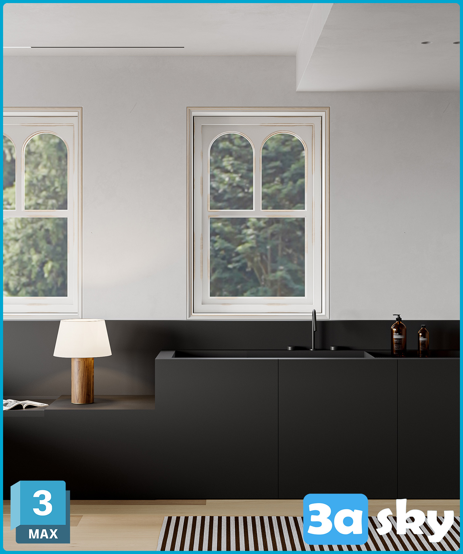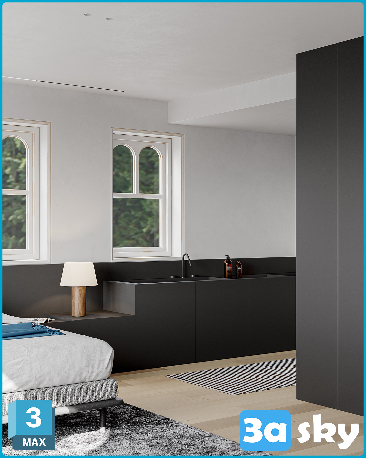 This 3D scene showcases a modern bed design created in 3DS MAX. The scene features a sleek and contemporary bed frame with stylish bedding and decor. Perfect for interior designers, architects, and anyone looking for high-quality 3D models for their projects.