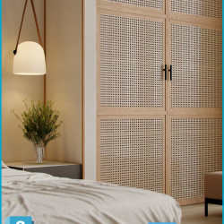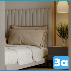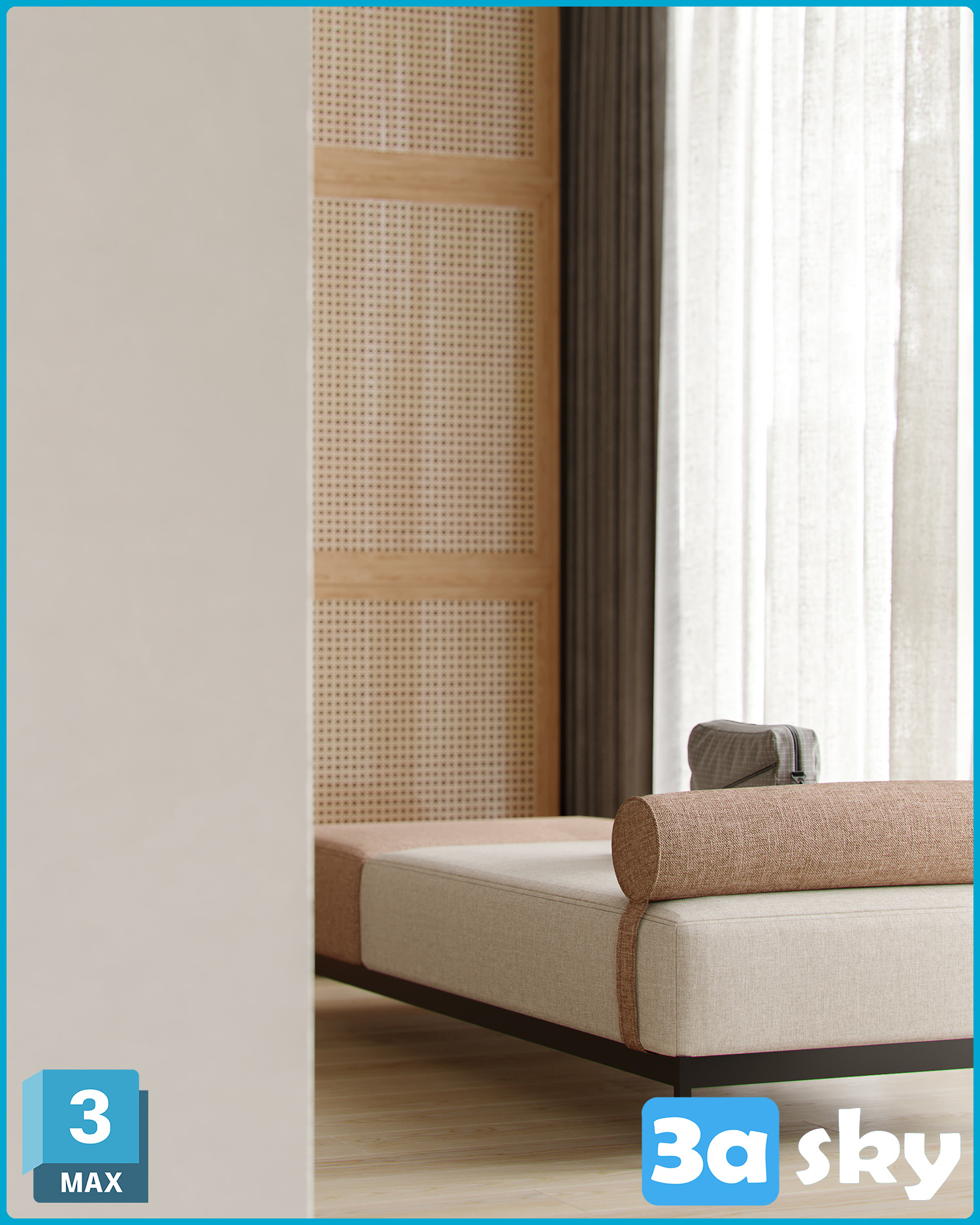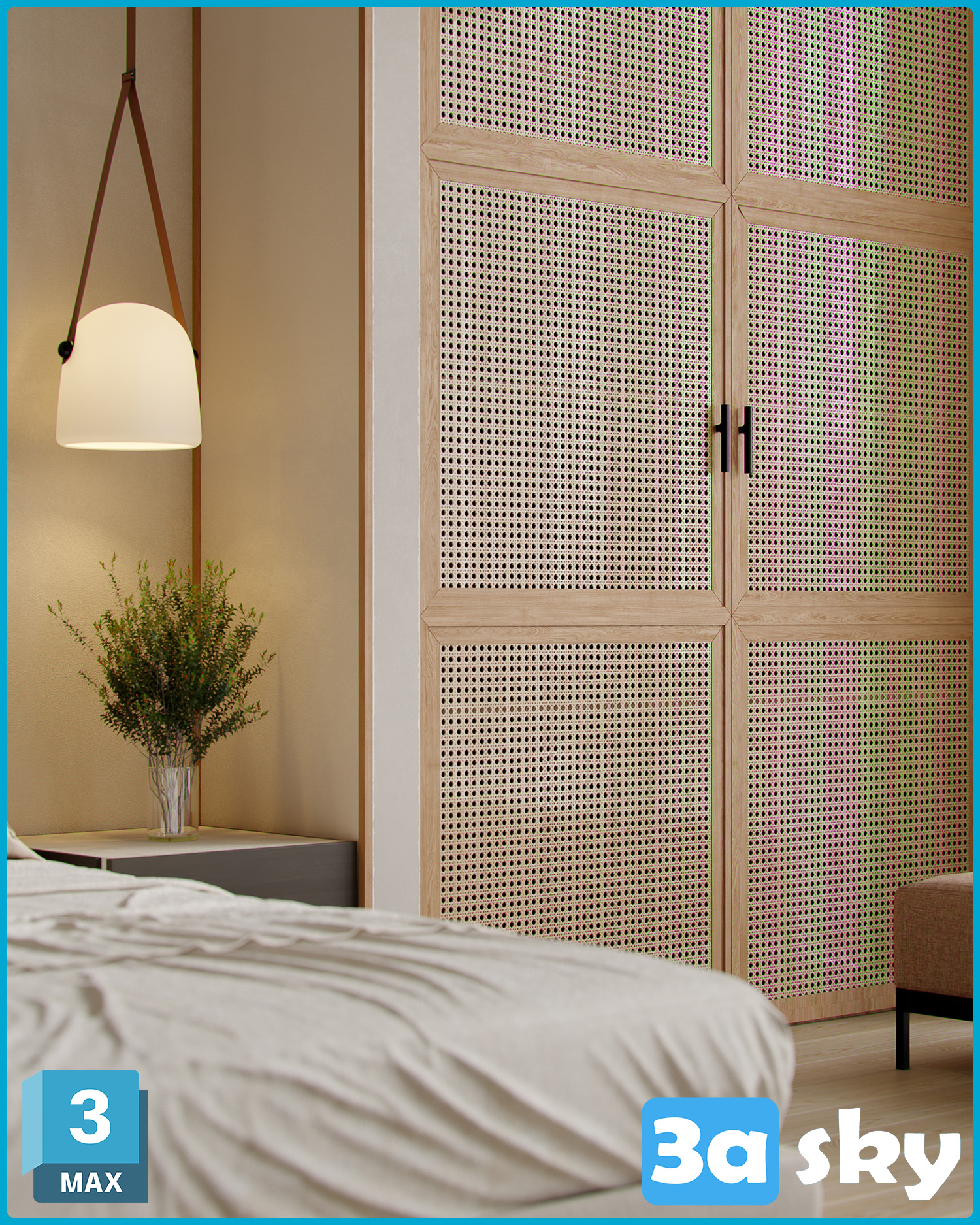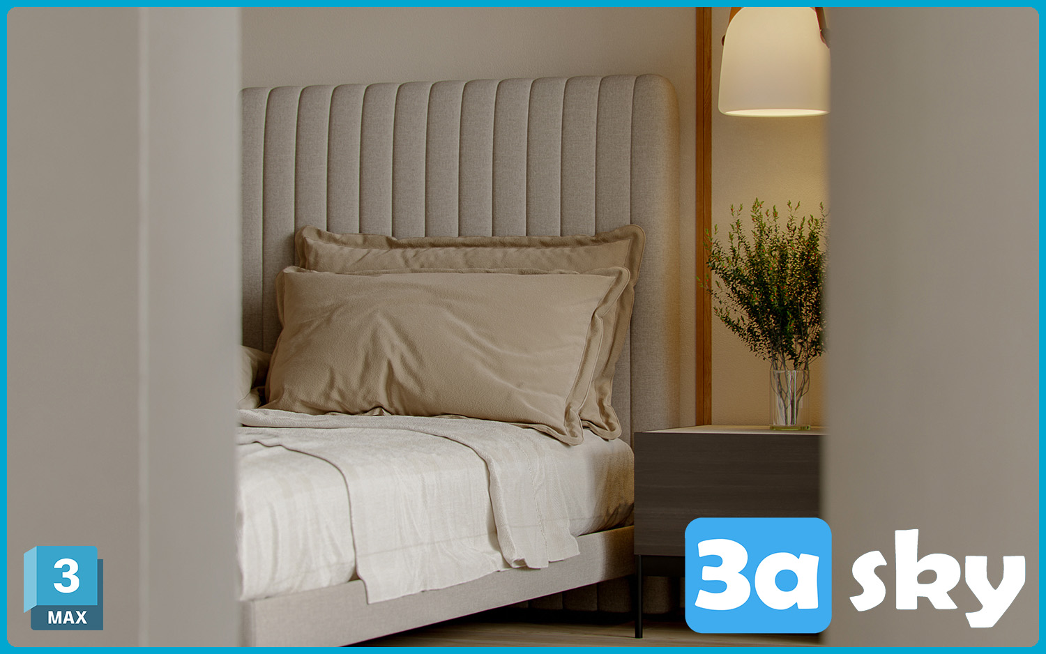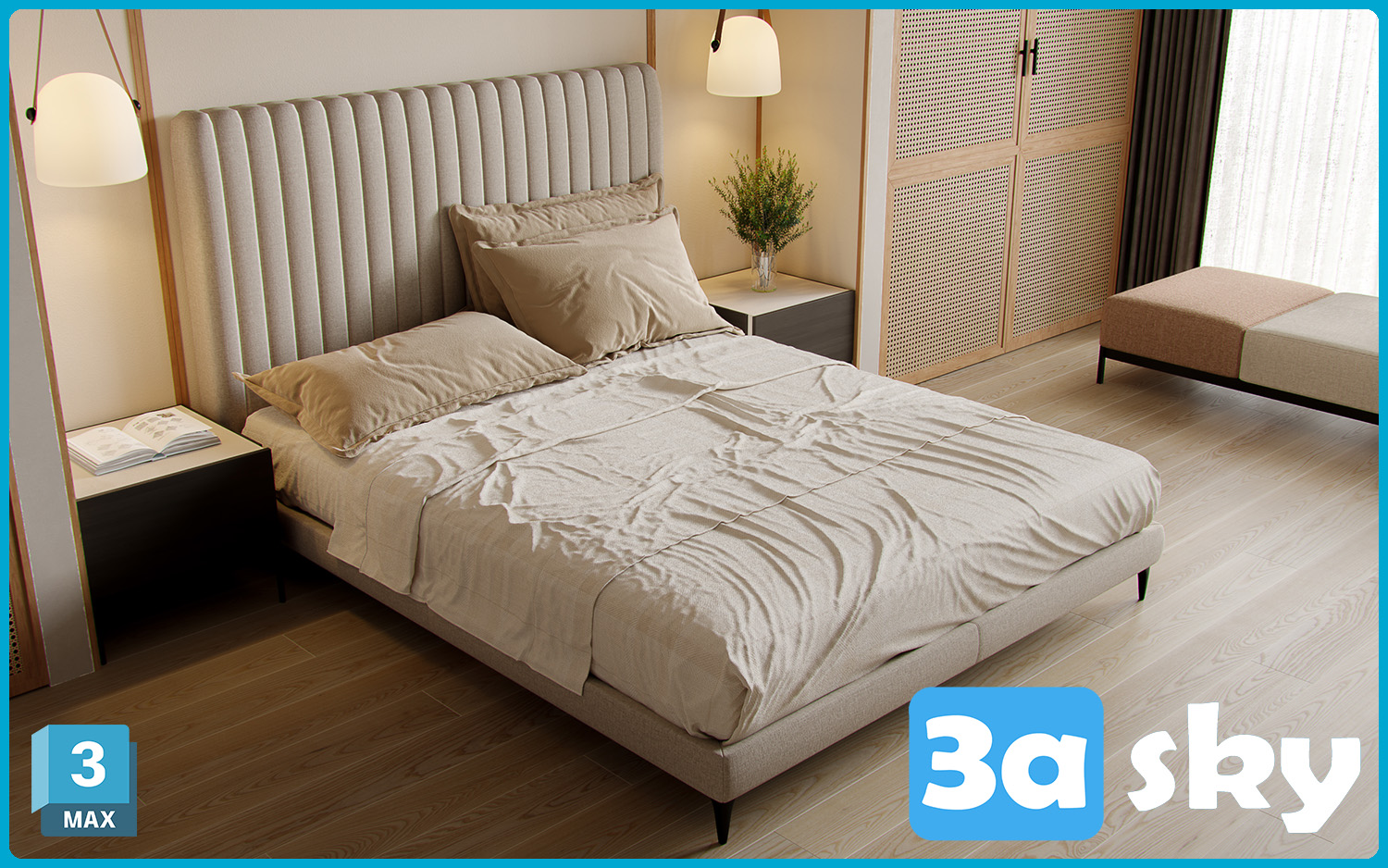 This 3D scene showcases a modern bedroom interior design created using 3DS MAX software. The scene includes a stylish bed, elegant lamp, and decorative elements. Perfect for interior visualization projects and design inspiration.