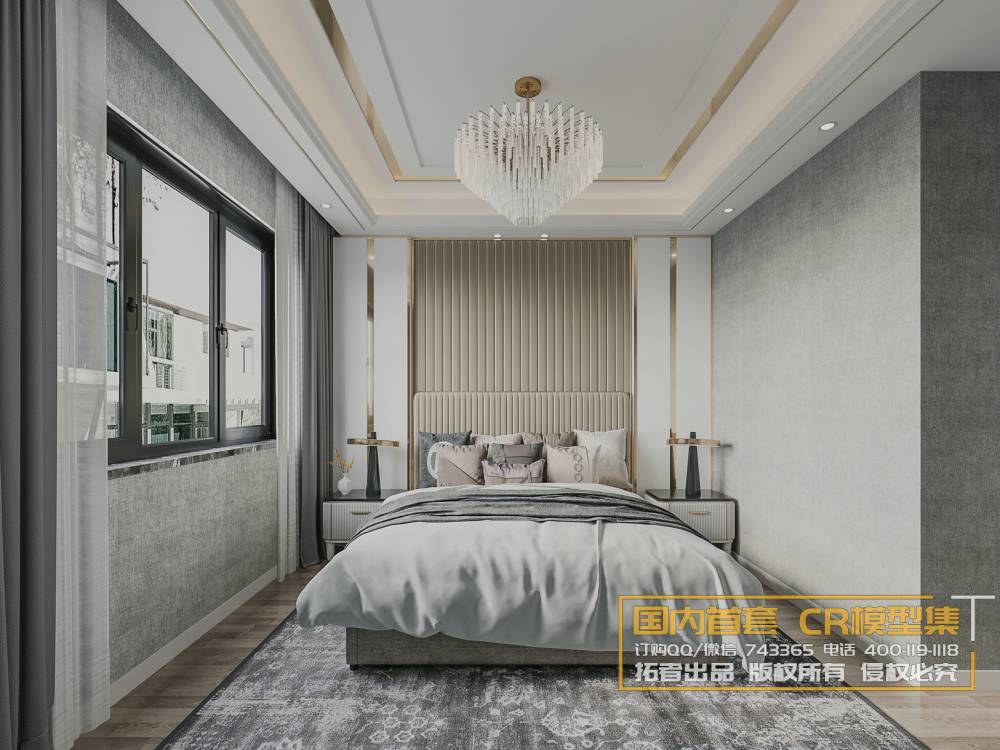 This 3D scene showcases a modern bedroom interior design created with 3DS MAX. The scene includes detailed furniture and decor elements, providing a realistic visualization of a contemporary bedroom setting.