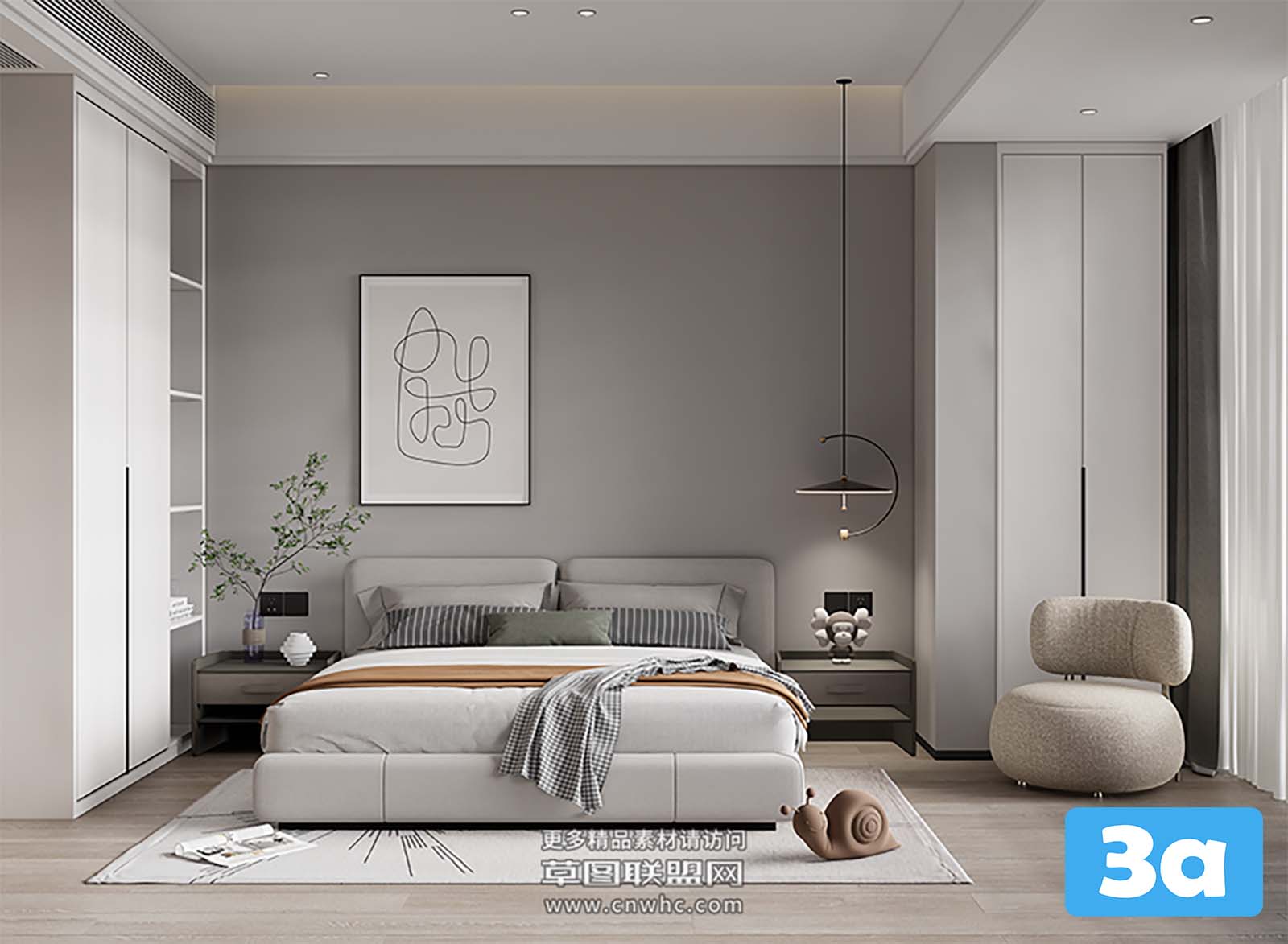 This 3D scene features a modern bedroom with contemporary interior design. The room is elegantly furnished with stylish decor and bedroom furniture. Explore the layout and design elements for inspiration in your own interior design projects.
