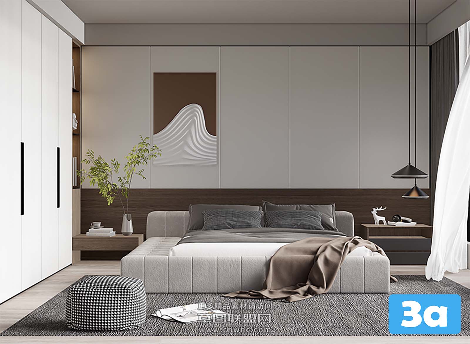 This 3D scene features a modern bedroom with contemporary interior design elements. The room is styled with sleek and stylish decor, creating a cozy and inviting atmosphere. Explore the details of this beautifully designed space.