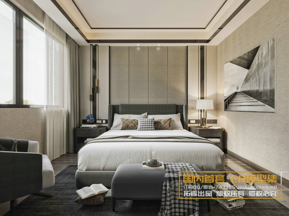 This 3D scene showcases a modern bedroom interior design created using 3DS MAX software. The scene is detailed and high quality, suitable for interior visualization projects. The design features modern furniture and decor elements, providing a realistic and visually appealing representation of a contemporary bedroom setting.