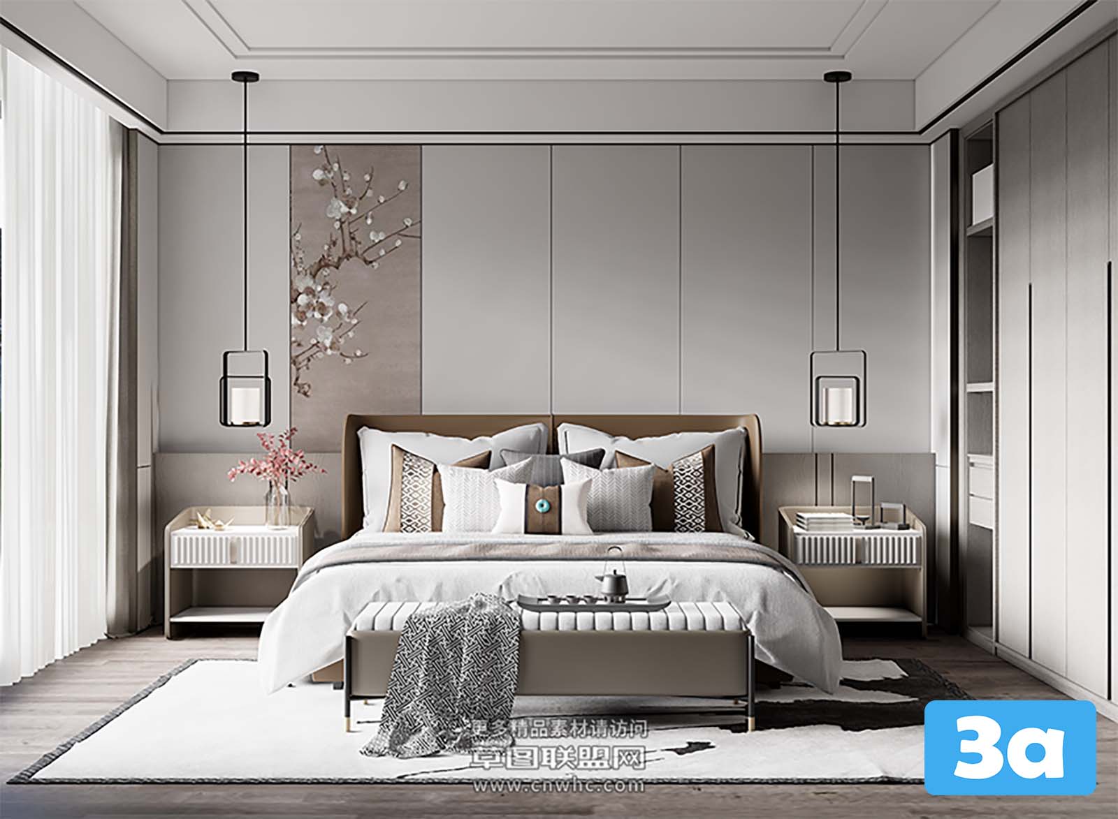 This 3D scene features a modern bedroom with contemporary interior design. The room is elegantly furnished with stylish decor and bedroom furniture. Explore the layout and design elements for inspiration in your own interior design projects.