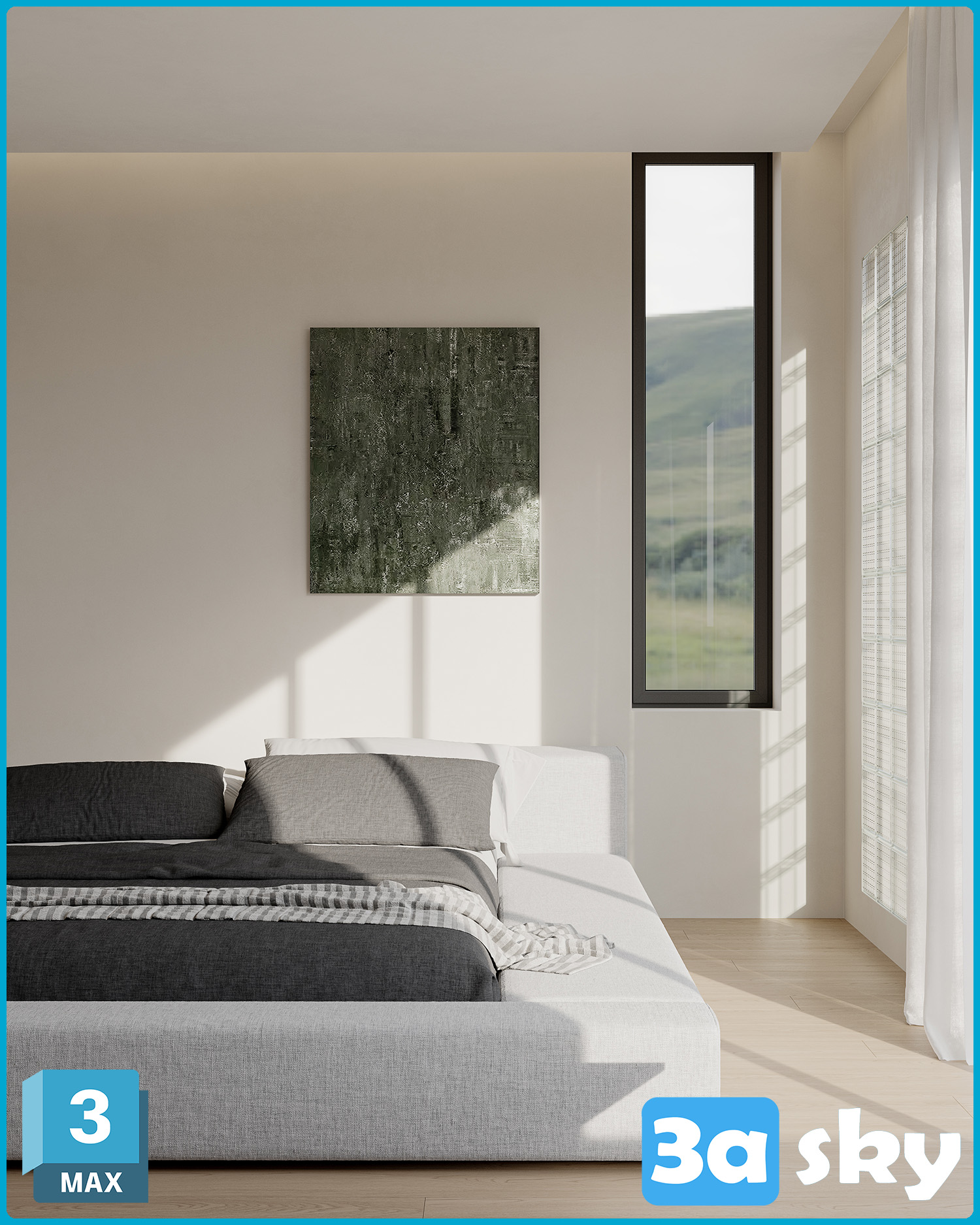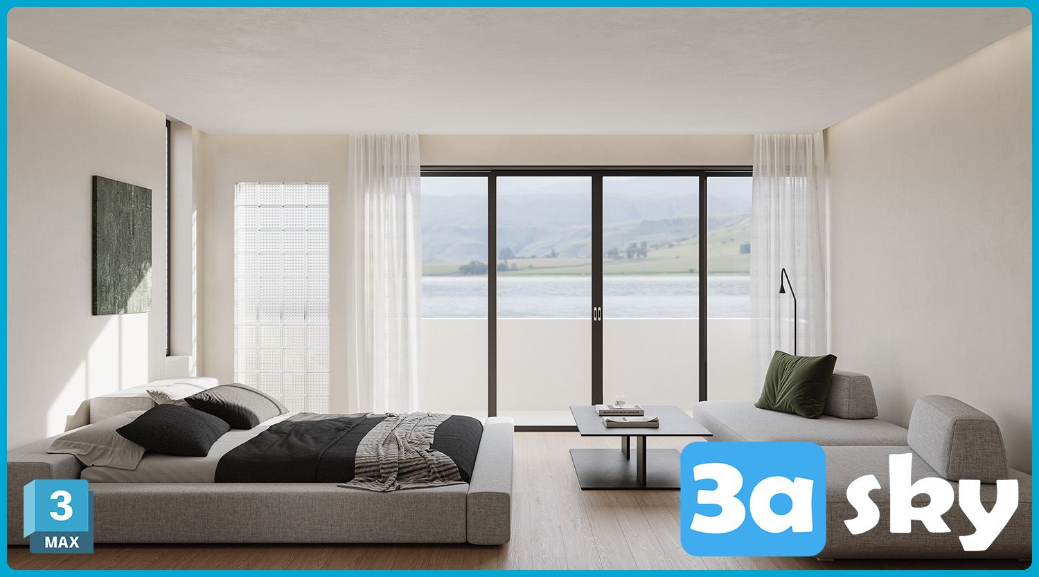 This 3D scene showcases a modern bedroom interior design created using 3DS MAX software. The scene features a stylish bed, elegant lamp, and decorative elements. Perfect for interior visualization projects and design inspiration.