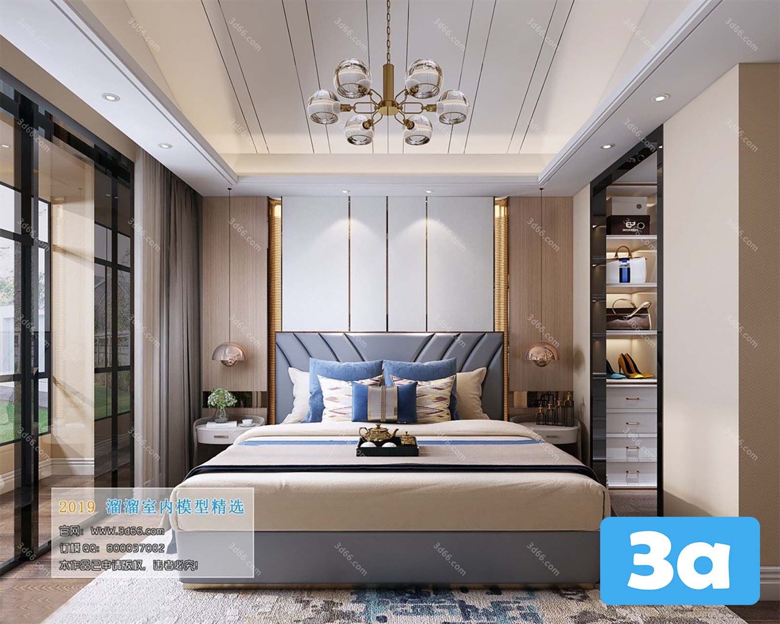 This 3D scene features a modern bedroom design with contemporary furniture and interior elements. The room is elegantly designed with a focus on simplicity and functionality. Explore this 3D model to get inspiration for your own interior design projects.