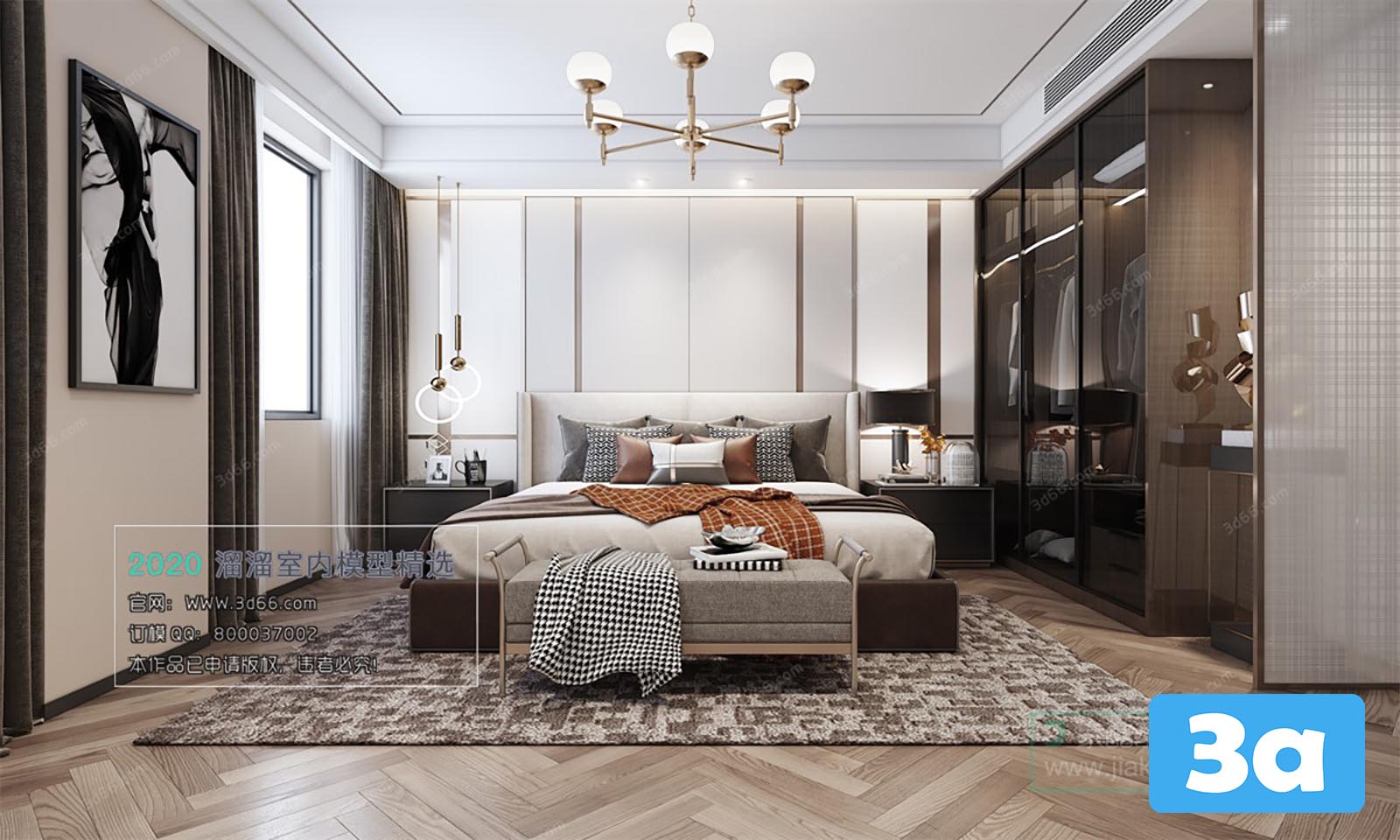 This 3D scene showcases a modern bedroom design with stylish interior elements. Explore the intricate details and layout of this contemporary bedroom setting. The design features a blend of modern furniture, lighting, and decor, creating a visually appealing and functional space.
