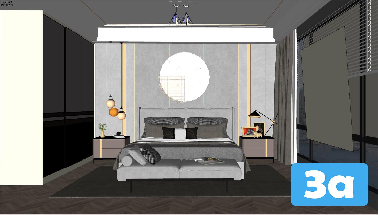 This 3D scene showcases a modern bedroom design with stylish furniture and decor. Explore the interior layout and design elements in this visually appealing setting.