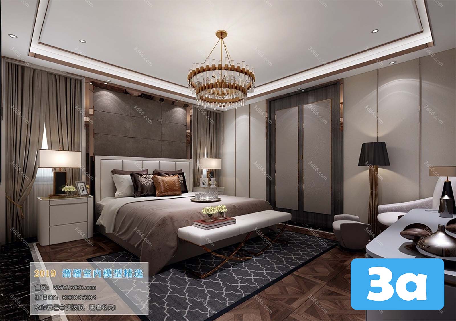 This 3D scene showcases a modern bedroom design with stylish furniture and decor. The interior layout is carefully crafted to create a cozy and contemporary living space. Explore the details of the room and get inspired for your own interior design projects.