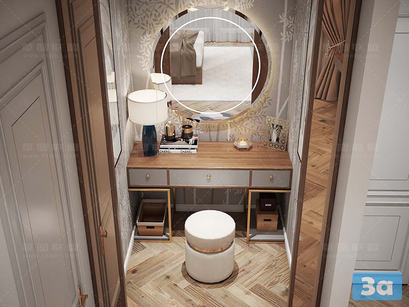This 3D scene showcases a modern bedroom design created using SketchUp and V-Ray rendering. The interior features contemporary elements and stylish decor, providing inspiration for your own design projects. Explore the details and layout of this beautifully designed bedroom scene.