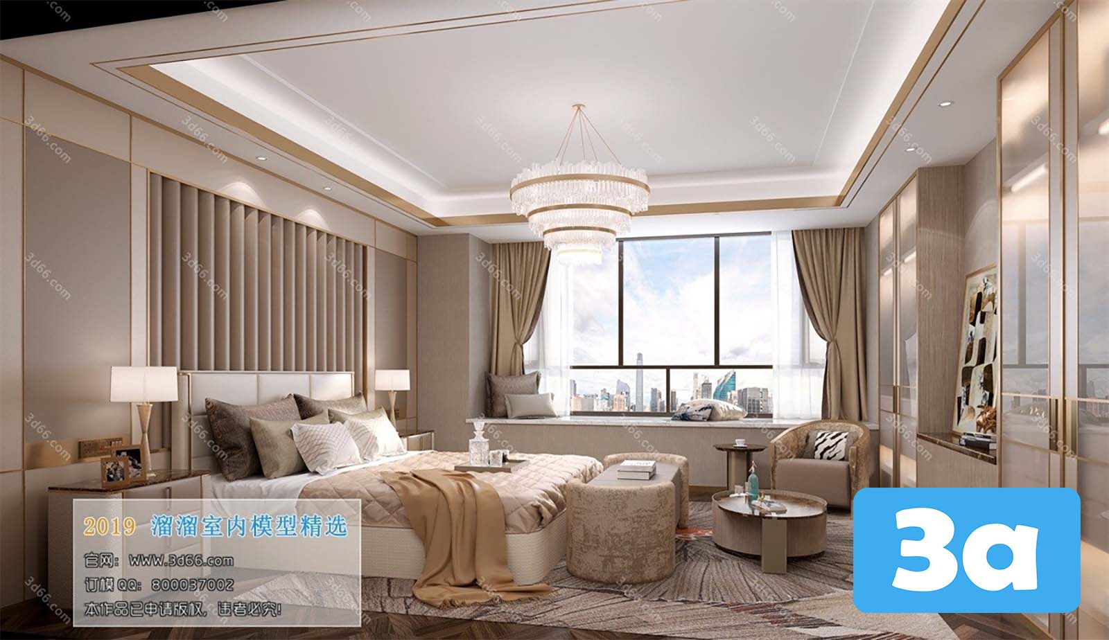 This 3D scene features a modern bedroom with stylish furniture and contemporary decor. The design is sleek and elegant, perfect for showcasing modern interior design concepts. Explore this 3D model to get inspiration for your own bedroom design projects.