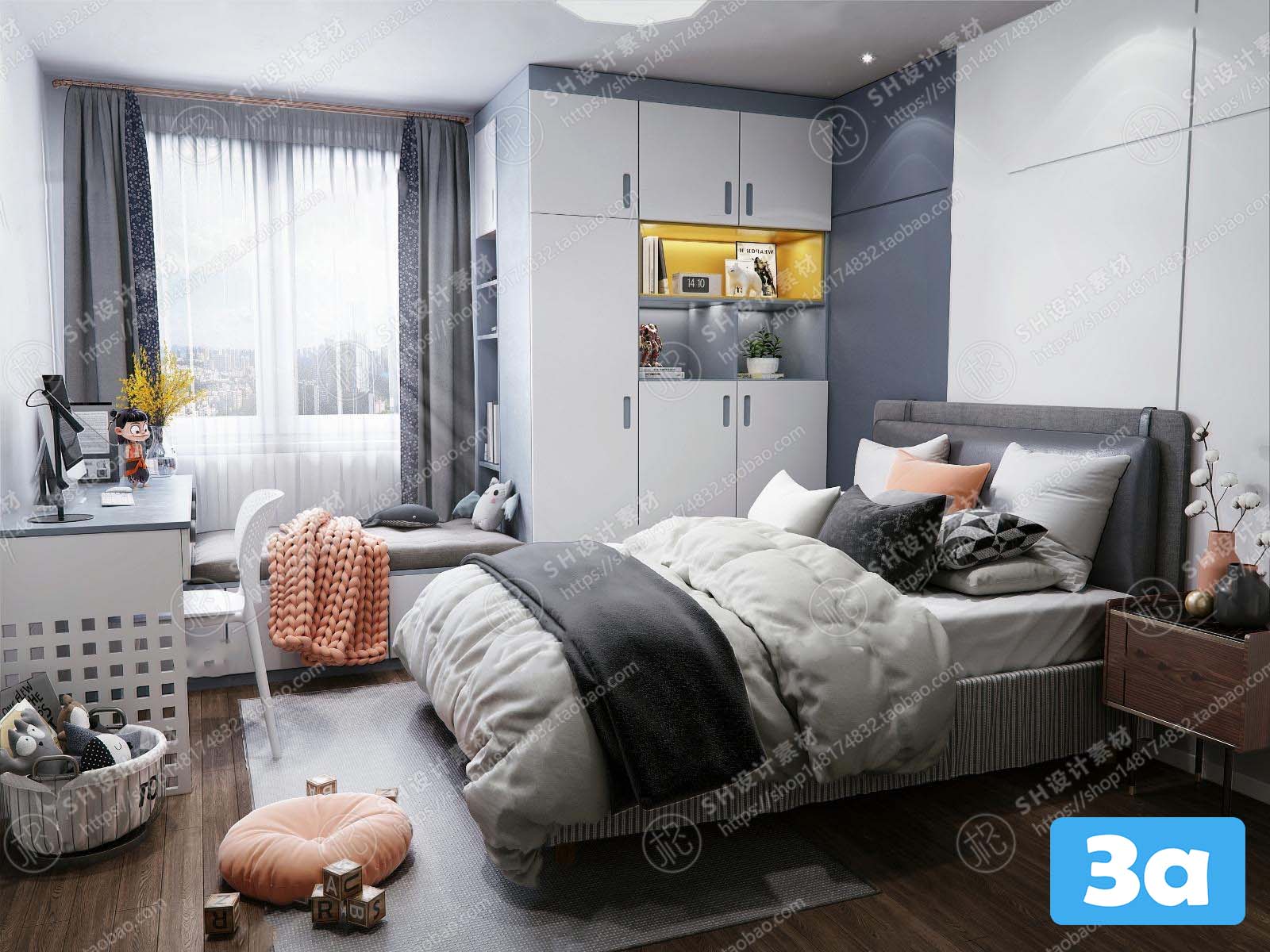 This 3D scene showcases a modern bedroom design with stylish furniture and decor. The layout is well-planned, offering a glimpse into a contemporary and cozy bedroom setting. Explore the details of the interior design and get inspired for your own home decor projects.