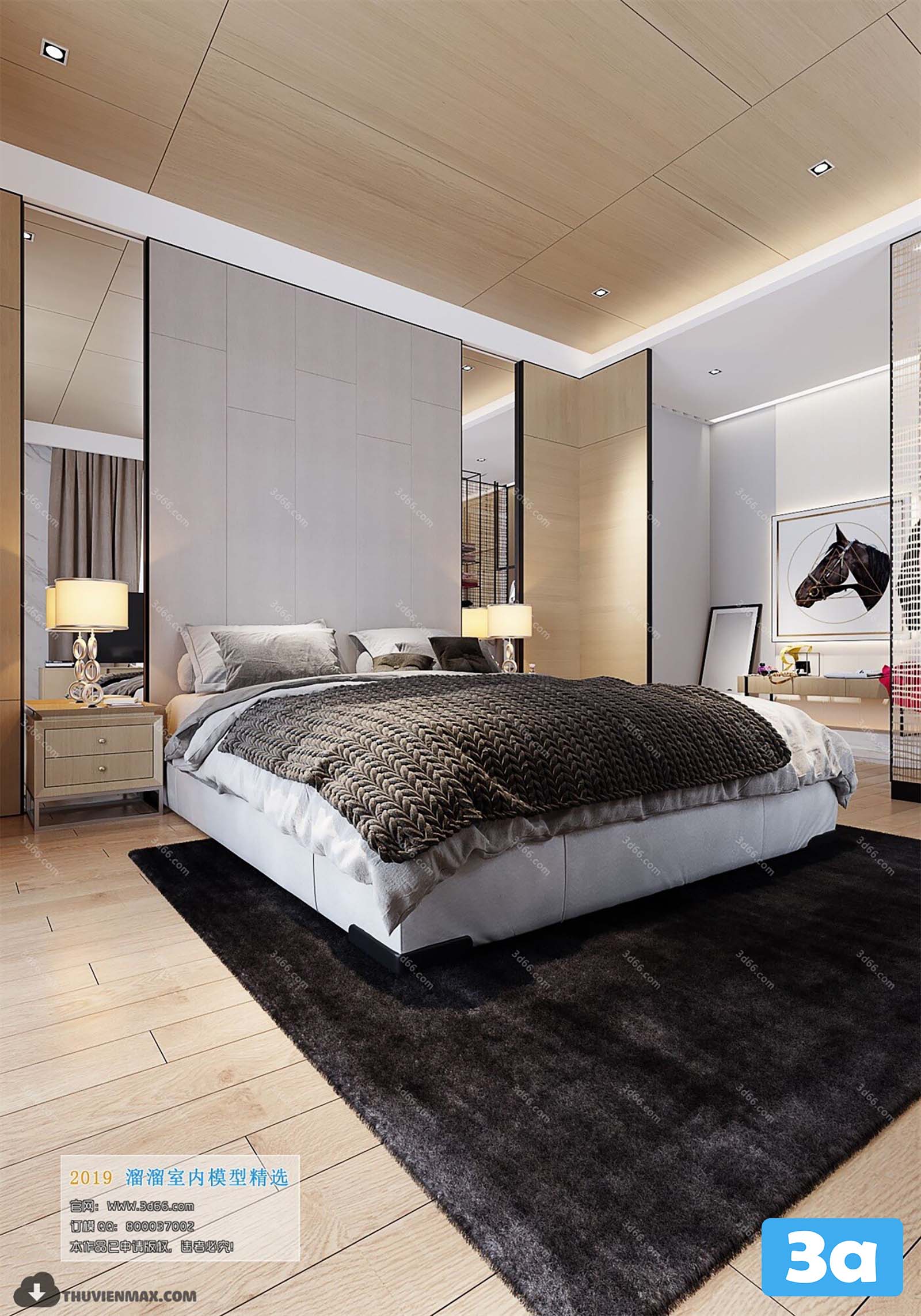 This 3D scene features a modern bedroom with contemporary furniture and decor. The design is sleek and stylish, perfect for showcasing modern interior design concepts. Explore this 3D model to get inspiration for your own bedroom design projects.