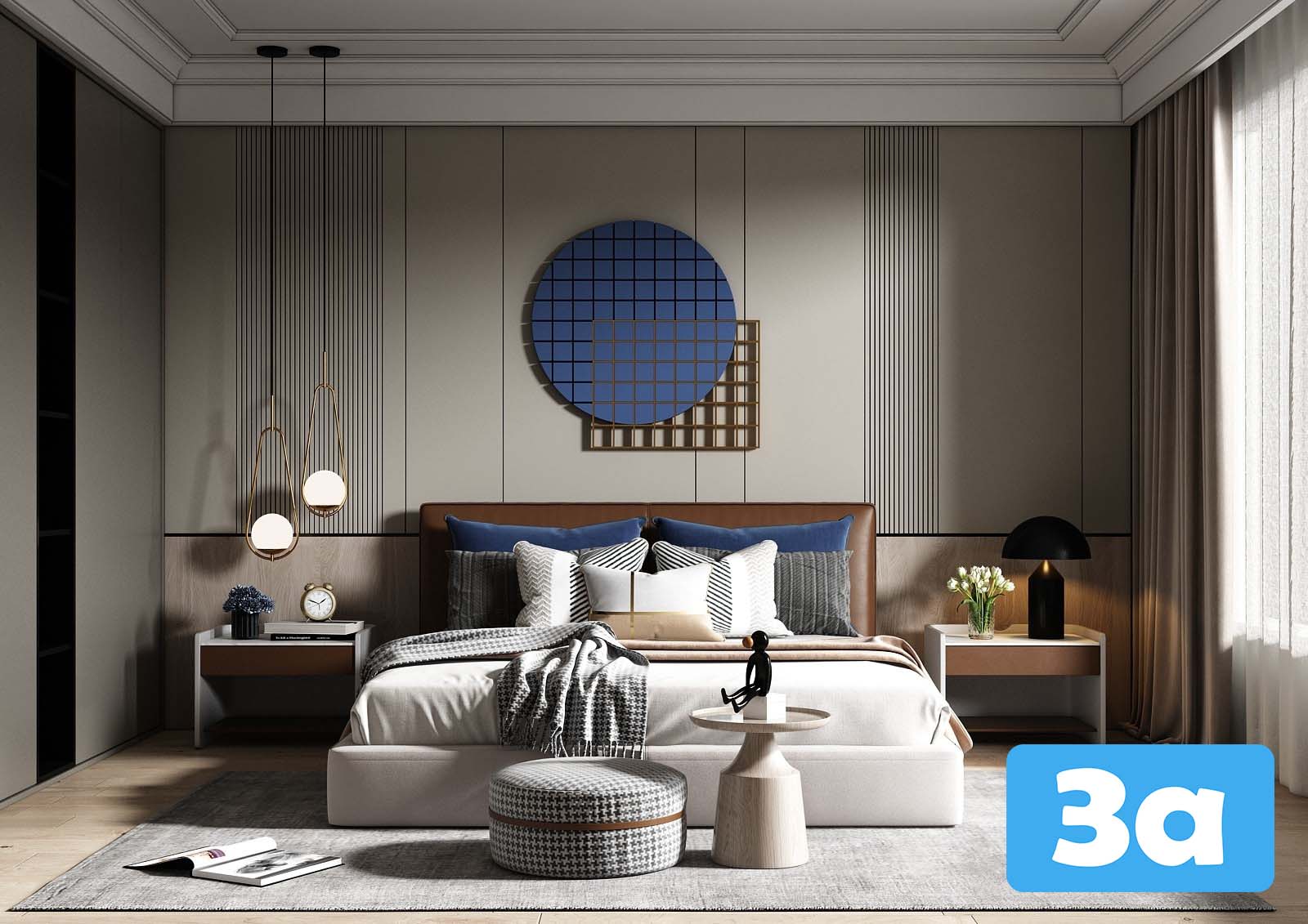 This 3D scene features a modern bedroom with contemporary furniture and decor. The design is sleek and stylish, perfect for showcasing modern interior design concepts. Explore this 3D model to get inspiration for your own bedroom design projects.