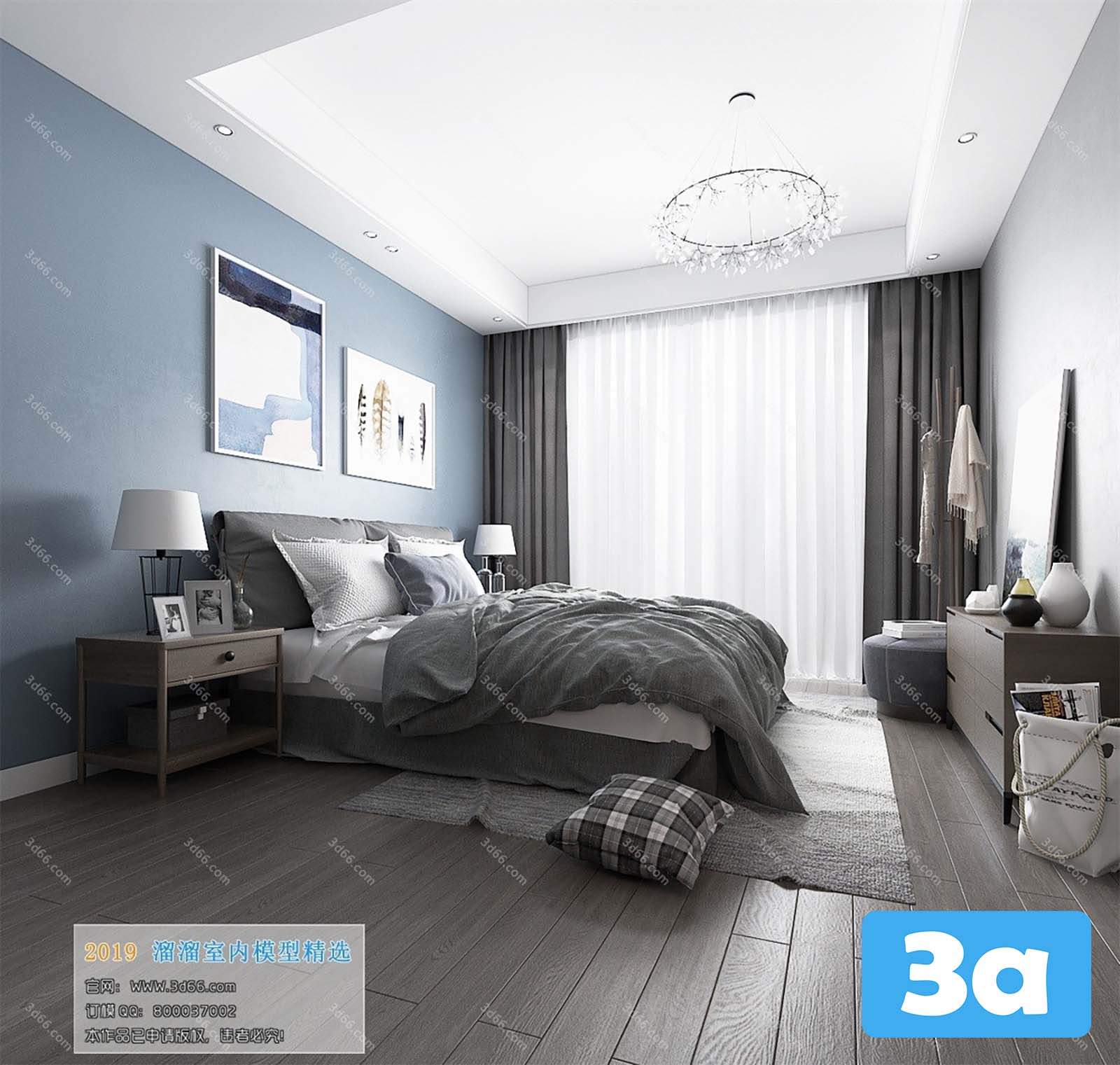 This 3D scene features a modern bedroom with stylish furniture and decor. The design is contemporary and inviting, perfect for showcasing interior design concepts.